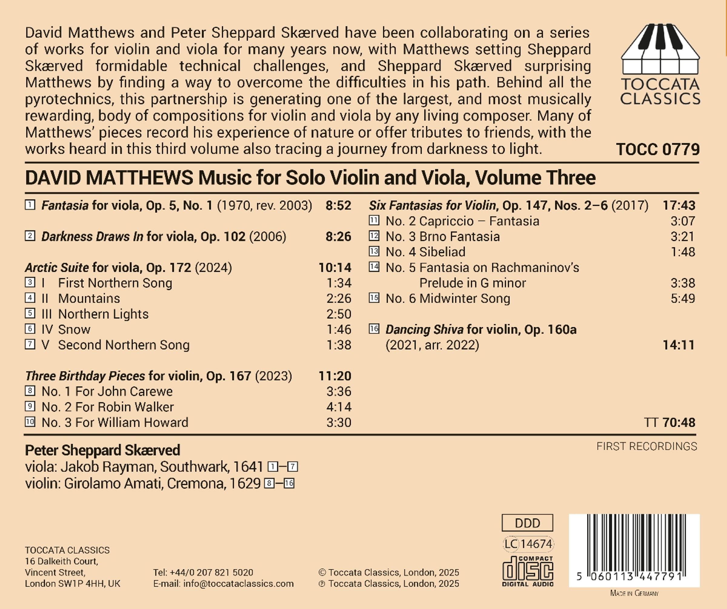 David Matthews und Peter Sheppard Skærved arbeiten seit vielen Jahren gemeinsam an einer Reihe von Werken für Violine und Viola, wobei der Komponist Matthews an Sheppard Skærved enorme technische Herausforderungen stellt und der Geiger Matthews wiederum überrascht, indem er einen Weg findet, die Schwierigkeiten zu meistern. Hinter all dem Feuerwerk entsteht aus dieser Partnerschaft eines der umfangreichsten und musikalisch lohnendsten Werke für Violine und Viola, das je von einem lebenden Komponisten geschaffen wurde. Viele von Matthews' Stücken spiegeln seine Erfahrungen mit der Natur wider oder sind Hommagen an Freunde. Auch die Werke in diesem dritten Album der Reihe - natürlich gespickt mit Ersteinspielungen - zeichnen eine Reise von der Dunkelheit zum Licht nach.