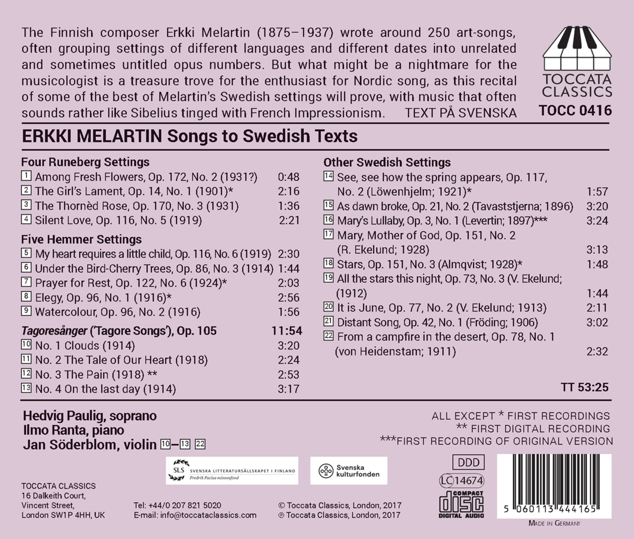 Erkki Melartin: Lieder "Songs to Swedish Texts" auf CD