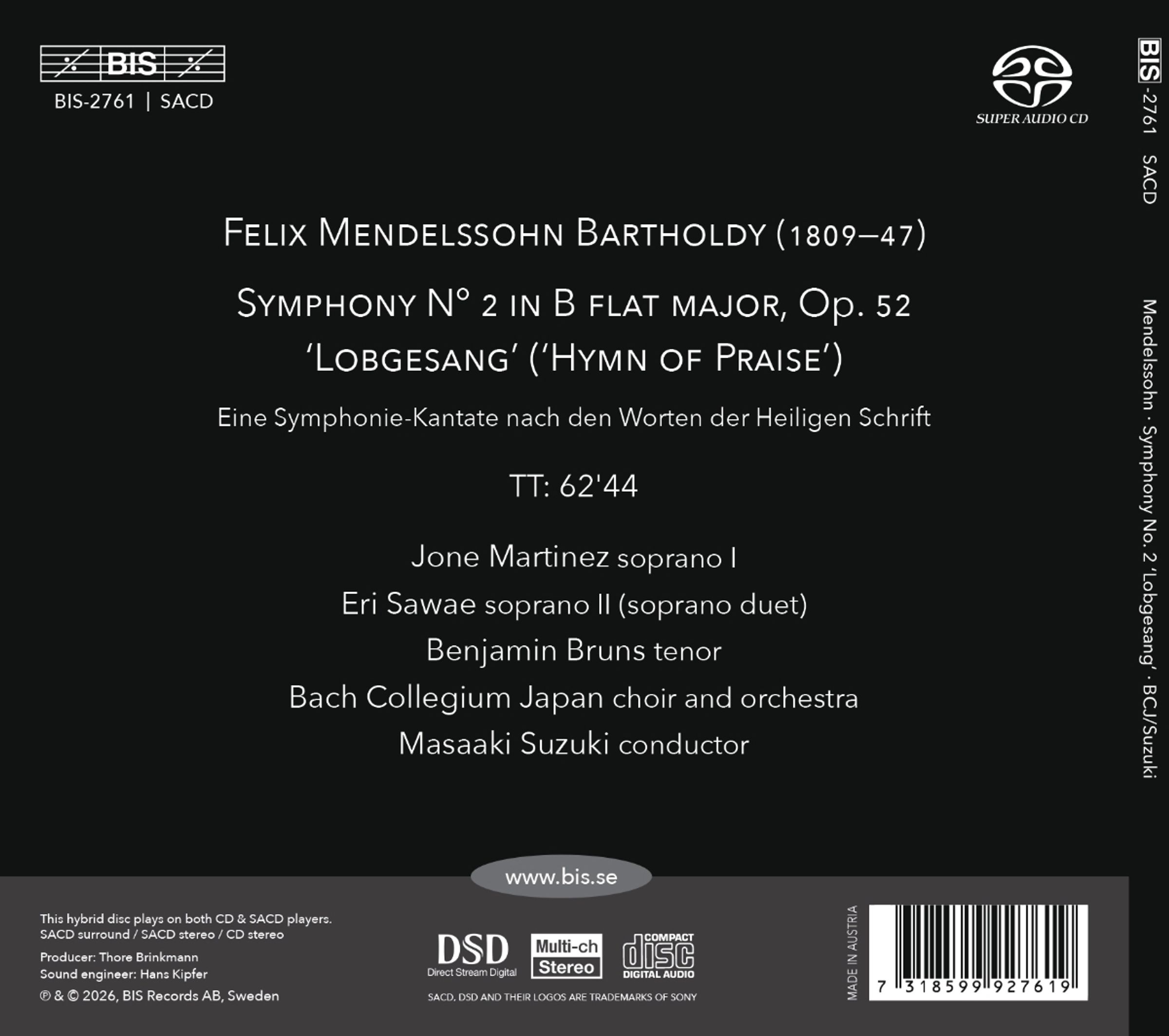 Masaaki Suzuki und das Bach Collegium Japan, bekannt für ihre maßgeblichen Interpretationen der Vokalmusik von Johann Sebastian Bach, haben auch für ihre Aufnahmen bedeutender Chor- und Orchesterwerke, darunter Wolfgang Amadeus Mozarts "Requiem" und "Messe in c-Moll", Beethovens "Missa Solemnis" und "Sinfonie Nr. 9" sowie Johannes Brahms' "Ein deutsches Requiem" viel Zuspruch von der Presse erhalten. In ihrem neuesten Projekt widmen sie sich Felix Mendelssohns Sinfonie-Kantate, der Sinfonie Nr. 2 "Lobgesang". Das für Solisten, Chor und Orchester komponierte Werk besteht aus drei sinfonischen Sätzen und einem Schlusschor - eine Struktur, die deutlich an Beethovens Neunte Sinfonie erinnert. Mendelssohn geht jedoch noch einen Schritt weiter, indem er den abschließenden Kantaten-Teil auf zwei Drittel der Gesamtdauer des Werks ausdehnt. Der Text basiert auf Bibelauszügen und eigens in Auftrag gegebenen Gedichten. Die ersten sinfonischen Sätze, die von der deutschen Romantik geprägt sind, wechseln sich kunstvoll mit choralartigen Passagen ab und stellen eine tiefe Verbindung zur alten Kantatentradition her, die das monumentale Finale prägt. Das Werk wurde in der Thomaskirche in Leipzig (derselben Kirche, in der Mendelssohns Held Johann Sebastian Bach einst tätig war) uraufgeführt und feiert den 400. Jahrestag der Erfindung des Buchdrucks durch Gutenberg. Es war sofort ein durchschlagender Erfolg und wurde schnell zu einem der meistgespielten Werke zu Mendelssohns Lebzeiten.