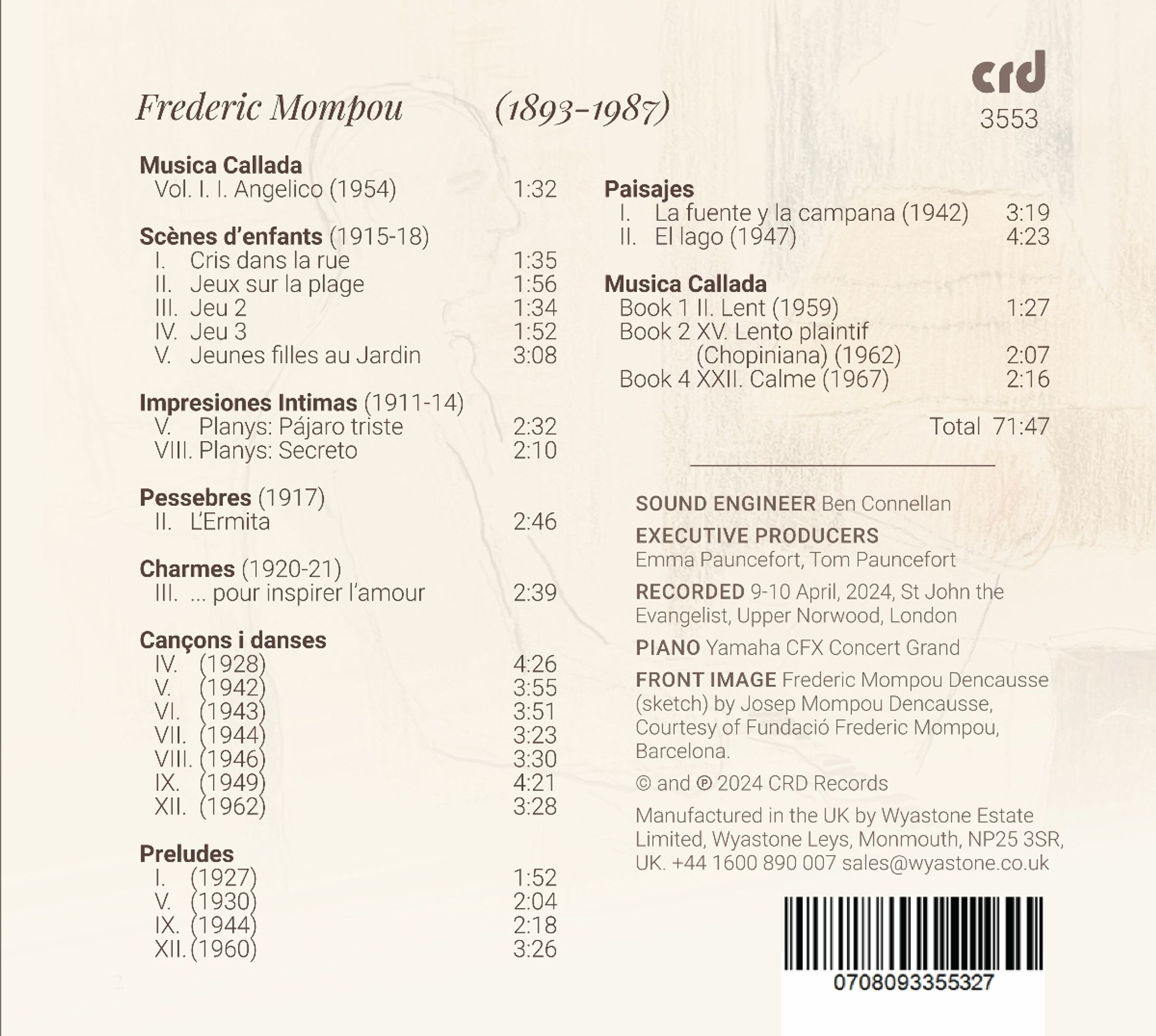 In den 'Blütezeit' der Plattenindustrie, in den 1970er Jahren, wetteiferten die Plattenfirmen darum, den klassischen Kanon aufzunehmen. Als wegweisendes Label stand CRD natürlich an der Spitze dieses Trends und hatte das Privileg, unter anderem mit dem Pianisten Paul Crossley an den gesamten Klavierwerken von Gabriel Faure und Maurice Ravel zu arbeiten. Auch heute noch werden verborgene Schätze der klassischen Musik entdeckt, und wir werden dazu angeregt, Genregrenzen zu überdenken, während wir lange vernachlässigte Stimmen wieder zu Gehör bringen. Gleichzeitig gibt es noch ein weiteres wichtiges Unterfangen: die sorgfältige Zusammenstellung der Werke eines Komponisten. Das ist der Schwerpunkt dieser Veröffentlichung. Die Klavierwerke von Frederic Mompou sind gut dokumentiert, nicht zuletzt durch den Maestro selbst in seinen eigenen Aufnahmen, die 1974 in Barcelona entstanden sind. Warum also dieses Repertoire 50 Jahre später erneut aufnehmen? Aus unserer Sicht ist es eine passende Wahl, da wir unser 50-jähriges Jubiläum als Label feiern, das sich durch die Darbietungen von Weltklassekünstlern für das klassische Repertoire einsetzt. Aber es muss noch mehr dahinterstecken. Die Musik ist heute so zugänglich und der Wunsch nach Viralität so groß, dass wir offenbar vergessen haben, wie sehr sie für ihren Schöpfer eine ganz private und intime Leistung sein konnte. Paul Crossley ermutigt uns, wie Mompou es von Anfang an tat, auf die Stille zu hören und tief in die Schatten zu blicken. In einer Welt, in der unsere Aufmerksamkeit ständig auf viele Dinge gleichzeitig gerichtet ist, sind solche Alben vielleicht mehr denn je gefragt. (Emma Pauncefort & Tom Pauncefort, Direktoren des CRD)