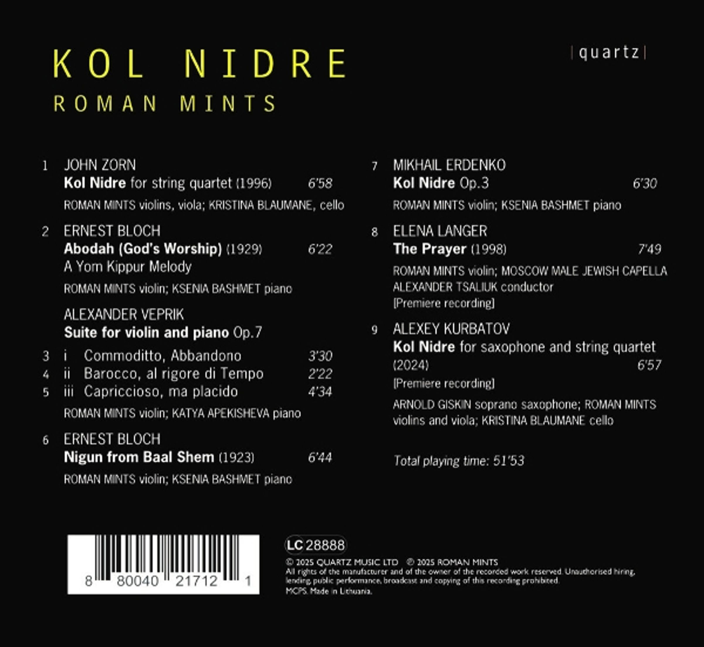 Dieses Projekt ist ein zutiefst persönliches Musikalbum, das auf jüdischen Themen basiert, die durch die Linse der persönlichen Geschichte, Erinnerung und Identitätssuche neu interpretiert werden. Im Mittelpunkt steht "Kol Nidre" - ein altes Gebet, das seit langem Debatten auslöst und klassische Komponisten inspiriert. Das Album verwebt Tradition, Kindheitserinnerungen, vergessene Musik, die Stimmen unterdrückter Komponisten und musikalische Brücken zwischen den Kulturen. Es ist mehr als nur eine Sammlung von Stücken - es ist eine musikalische Reflexion über Erbe, Hoffnung und Zugehörigkeit. Das Album enthält zwei Weltpremierenaufnahmen: Elena Langers "The Prayer" und Alexey Kurbatovs "Kol Nidre". Roman Mints ist ein britischer Geiger. Er wurde in Moskau geboren und hat russische Premieren von Osvaldo Golijov, John Tavener, James MacMillan, Giacinto Scelsi und Marjan Mozetich sowie eine Vielzahl von Weltpremieren gegeben. Er gründete das jährliche Homecoming Chamber Music Festival, das in Moskau stattfindet. Auf dieser Aufnahme arbeitet er mit Kristina Blaumane, Katya Apekisheva, Ksenia Bashmet und der Moscow Male Jewish Capella unter der Leitung von Alexander Tsaliuk zusammen.