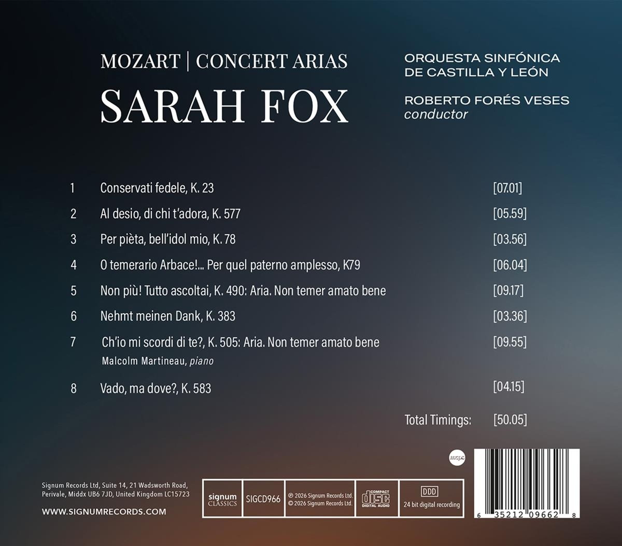 Sarah Fox präsentiert eine Auswahl von Mozarts Konzertarien, aufgenommen mit dem Orquesta Sinfónica de Castilla y León unter der Leitung von Roberto Fores Veses und mit Malcolm Martineau am Klavier. Das Programm, das Mozarts gesamtes Schaffen umfasst, enthält „Conservati fedele“ (K. 23), „Per pietà, bell’idol mio“ (K. 78), „Ch’io mi scordi di te?“ (K. 505) und „Vado, ma dove?“ (K. 583). Diese Werke, die für bestimmte Sänger und Anlässe geschrieben wurden, verbinden dramatische Intensität mit lyrischer Raffinesse und zeigen Mozarts Begabung für ausdrucksstarke Vokalmusik und orchestrale Klangfarben. Diese Aufnahme vereint Fox’ Opernerfahrung und den unverwechselbaren Klang des Orchesters in einer konzentrierten Auseinandersetzung mit diesen fein gearbeiteten Konzertwerken.