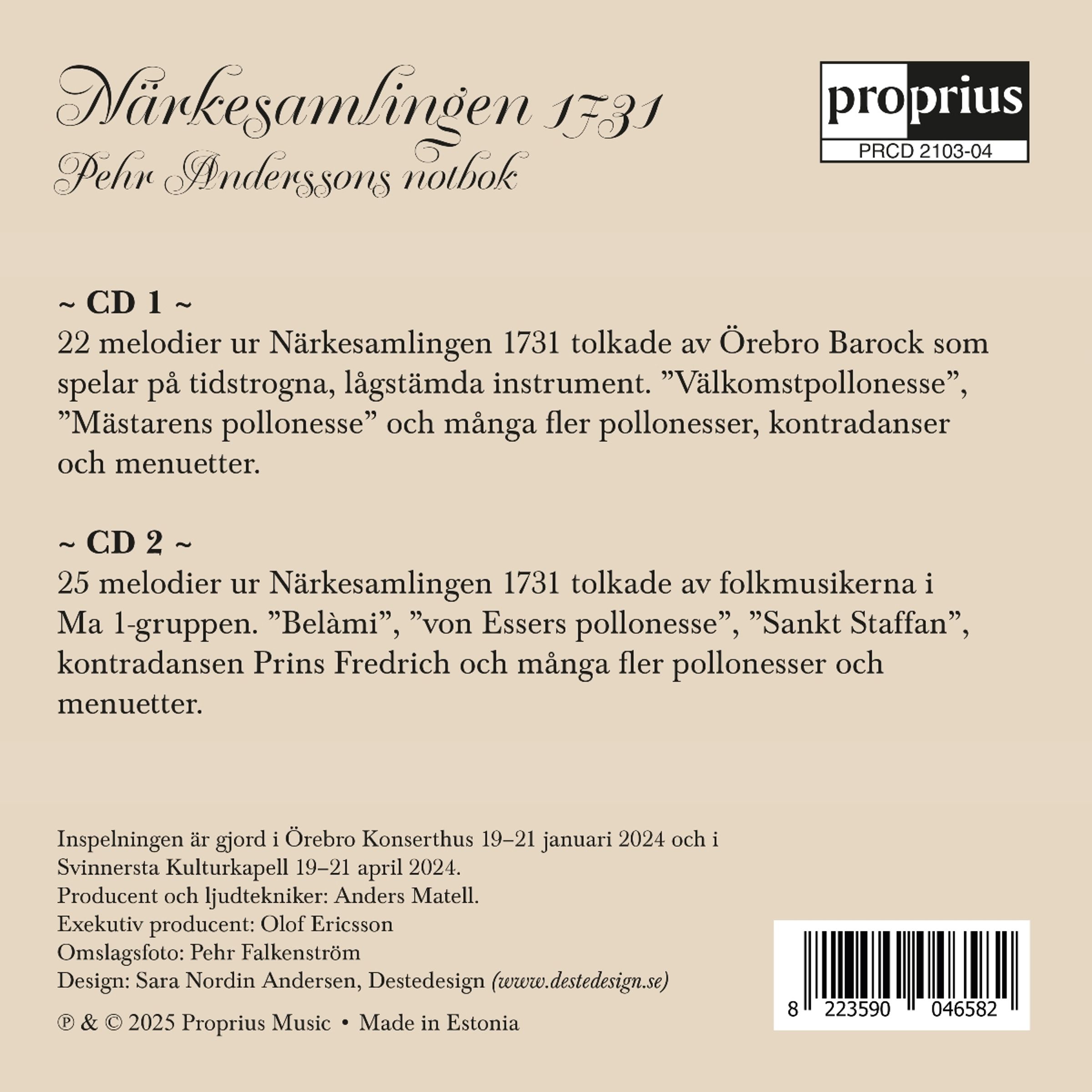 Die Närke-Sammlung, Pehr Anderssons Musikbuch aus dem Jahr 1731, wird nun durch ein Doppelalbum aus der Anonymität befreit. Um dieses Geigenbuch zu durchdringen und seine musikalische Sprache zu erkunden, wird ein Teil von einem Barockensemble - Örebro Barock - und der andere von den Volksmusikern der Gruppe Ma1 interpretiert. Im 18. Jahrhundert gab es Volksmusik und Barockmusik nicht als Begriffe, sondern die Musik floss ungehindert zwischen Bauernhöfen, Kirchen, Militärmusikern und Gutshäusern hin und her. "Närkesamlingen 1731" trägt dem Rechnung, indem sowohl Barock- als auch Volksmusikanten auf der Aufnahme zu hören sind. Obwohl das Originalmaterial alt ist, handelt es sich um eine Aufnahme voller Neuerungen. Mit ein oder zwei Ausnahmen wurde keines dieser Lieder zuvor zur Veröffentlichung aufgenommen - und die Hälfte der Lieder wurde zudem mit neuen, vom Barock inspirierten Stimmen arrangiert. Die Sammlung Närkes aus dem Jahr 1731 / Pehr Anderssons Notenbuch ist das älteste Notenbuch in der gesamten Sammlung der Volksmusikkommission, eine besonders interessante und spannende Zusammenstellung.