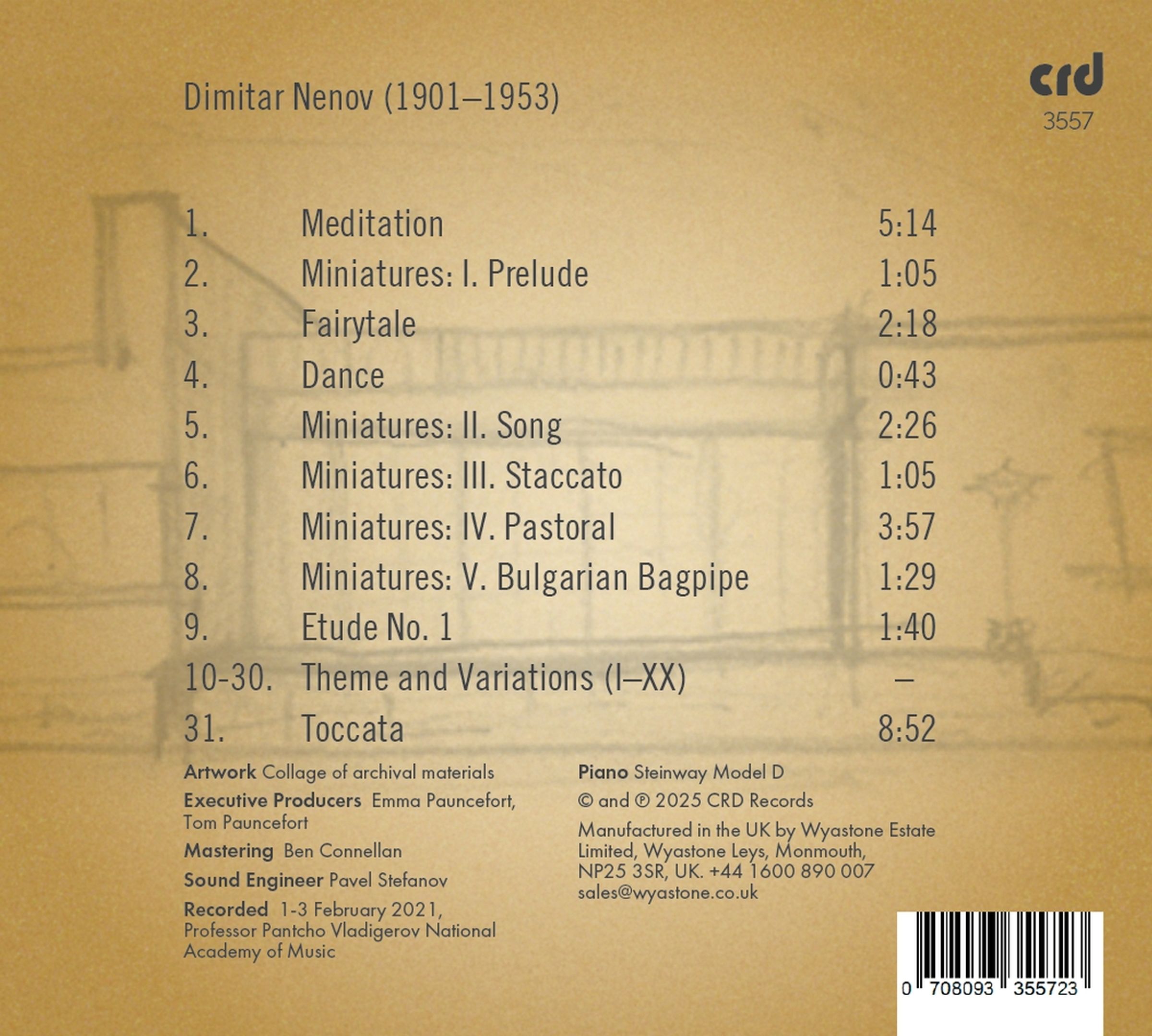 Dimitar Nenov (1901-1953) war ein Pianist und Komponist von außergewöhnlicher Tiefe, doch seine Musik ist außerhalb Bulgariens - wo er heute noch selten auf dem Programm steht - weitgehend unbekannt, obwohl er einen enormen Einfluss auf die osteuropäische Musik des 20. Jahrhunderts hatte. Seine Werke, die architektonische Präzision mit grenzenloser Fantasie verbinden, sind zugleich intellektuell anspruchsvoll und emotional tiefgründig. Dieses Album, eingespielt von der brillanten Veneta Neynska, bietet eine seltene Gelegenheit, Nenovs einzigartige Musiksprache durch die Kunstfertigkeit seiner heutigen Verfechterin zu erleben. Von den üppigen Harmonien seiner "Meditation" bis zur virtuosen Brillanz der "Toccata" offenbart diese Sammlung einen Komponisten, der nicht nur ein Meister des Klaviers, sondern auch ein Visionär des Klangs war. Die Pianistin Veneta Neynska, bekannt für ihre außergewöhnlich kreativen und spannenden Projekte, ist eine der emotional mitreißendsten und intellektuell fesselndsten Pianistinnen ihrer Generation. Als leidenschaftliche Verfechterin des musikalischen Erbes ihres bulgarischen Komponisten-, Pianisten- und Architektenkollegen Dimitar Nenov hat Neynska dessen Leben und Werk gründlich recherchiert und zusammen mit dem Regisseur Jassen Haralampiev einen von der Kritik gefeierten Musikdokumentarfilm über den legendären Künstler gedreht. Der Film zeigt die einzige erhaltene Aufnahme von Nenov, der weithin als der bedeutendste bulgarische Pianist aller Zeiten gilt. "Dimitar Nenov and the Dimensions of Elegance" wurde im Rahmen eines Kino-Konzerts in verschiedenen europäischen Hauptstädten präsentiert und ist mit Untertiteln in fünf Sprachen auf Venetas YouTube-Kanal frei zugänglich.