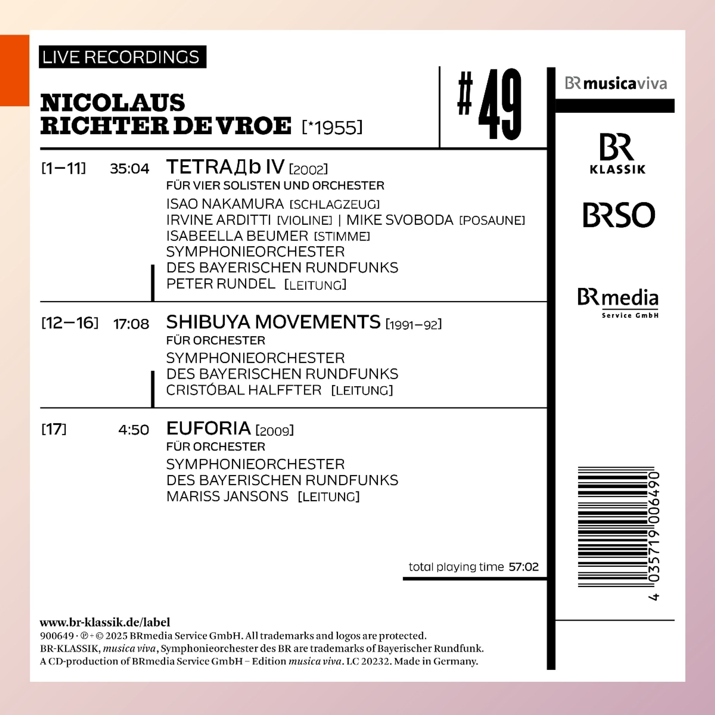 Die Werke des Violinisten und Komponisten Nicolaus Richter de Vroe (*1955) kamen und kommen regelmäßig bei den renommiertesten Veranstaltern und Festspielen für Neue Musik zur Aufführung. Der Musiker begann seine Ausbildung an der Spezialschule für Musik in Dresden, dem heutigen Sächsischen Landesgymnasium für Musik Carl Maria von Weber. Nach seinem Violinstudium am Tschaikowsky-Konservatorium in Moskau war er in verschiedenen Kammermusik-, Improvisations- und Experimentalensembles aktiv. 1980 wurde er Mitglied der Staatskapelle Berlin und schloss sein Kompositionsstudium bei Friedrich Goldmann und Georg Katzer an der Akademie der Künste der DDR ab. 1982 gründete er das Ensemble für Neue Musik Berlin (Ost), das sich rasch zu einem bedeutenden Forum für avancierte Musik in der DDR entwickelte. Seit Mitte der 1980er-Jahre ist Richter de Vroe mit Aufführungen seiner Werke und als Interpret bei sämtlichen ARD-Rundfunkanstalten sowie auf internationalen Festivals präsent. 1988 wurde er Mitglied des Symphonieorchesters des Bayerischen Rundfunks; ein Jahr später gründete er das XSEMBLE München – ein Ensemble, das sich durch experimentelle Programmgestaltung und stilistische Offenheit auszeichnet. 1996 war er Mitbegründer der Münchener Gesellschaft für Neue Musik, die sich der Vermittlung und Förderung zeitgenössischer Musik widmet. Neben seiner Tätigkeit als Komponist und Interpret ist Richter de Vroe seit 1994 regelmäßig mit Vorträgen, Porträtkonzerten und Werkpräsentationen bei Goethe-Instituten weltweit zu Gast. 2008 wurde in die Sächsische Akademie der Künste aufgenommen. Richter de Vroes Komposition TETRAДb IV für vier Solisten und Orchester entstand 2002 als Kompositionsauftrag der musica viva des Bayerischen Rundfunks. Die auf der vorliegenden CD mitgeschnittene Uraufführung durch Isao Nakamura (Schlagzeug), Irvine Arditti (Violine), Mike Svoboda (Posaune) und Isabeella Beumer (Stimme) sowie das Symphonieorchester des Bayerischen Rundfunks unter Leitung von Peter Rundel fand am 15. November 2002 im Herkulessaal der Münchner Residenz statt. – Obwohl zur großen Orchesterbesetzung vier Solisten hinzukommen, ist das Werk kein Konzert oder Concerto grosso. Die Solopartien besitzen so ausgeprägte Individualitäten, dass sie kaum wetteifernd zu Konzertieren vermögen. Auch treten sie nacheinander auf; jeder prägt einen längeren Abschnitt des Werks mit seiner spezifischen Diktion und erst gegen Ende sind sie gemeinsam zu hören. Dem Solo der Vokalistin, liegt ein Gedicht des experimentellen russischen Dichters Daniil Charms zugrunde. Richter de Vroes künstlerische Affinität zum Denken von Charms äußert sich im Titel TETRAДb IV – das russische Wort „Tetra“, in dem hier nur der letzte Buchstabe kyrillisch geschrieben ist, bedeutet „Heft“ – wie der experimentellen Annäherung an dessen Text. Shibuya Movements für Orchester entstand 1991 / 92 gleichfalls im Auftrag der musica viva des Bayerischen Rundfunks. Die vorliegende CD bietet den Mitschnitt der Uraufführung vom 15. Mai 1992 durch das Symphonieorchester des Bayerischen Rundfunks unter Leitung von Cristóbal Halffter aus dem Herkulessaal der Münchner Residenz. Euforia für Orchester entstand 2009; die Uraufführung vom 31. Oktober 2009 durch das Symphonieorchester des Bayerischen Rundfunks unter Leitung von Mariss Jansons fand am gleichfalls im Herkulessaal der Münchner Residenz statt.