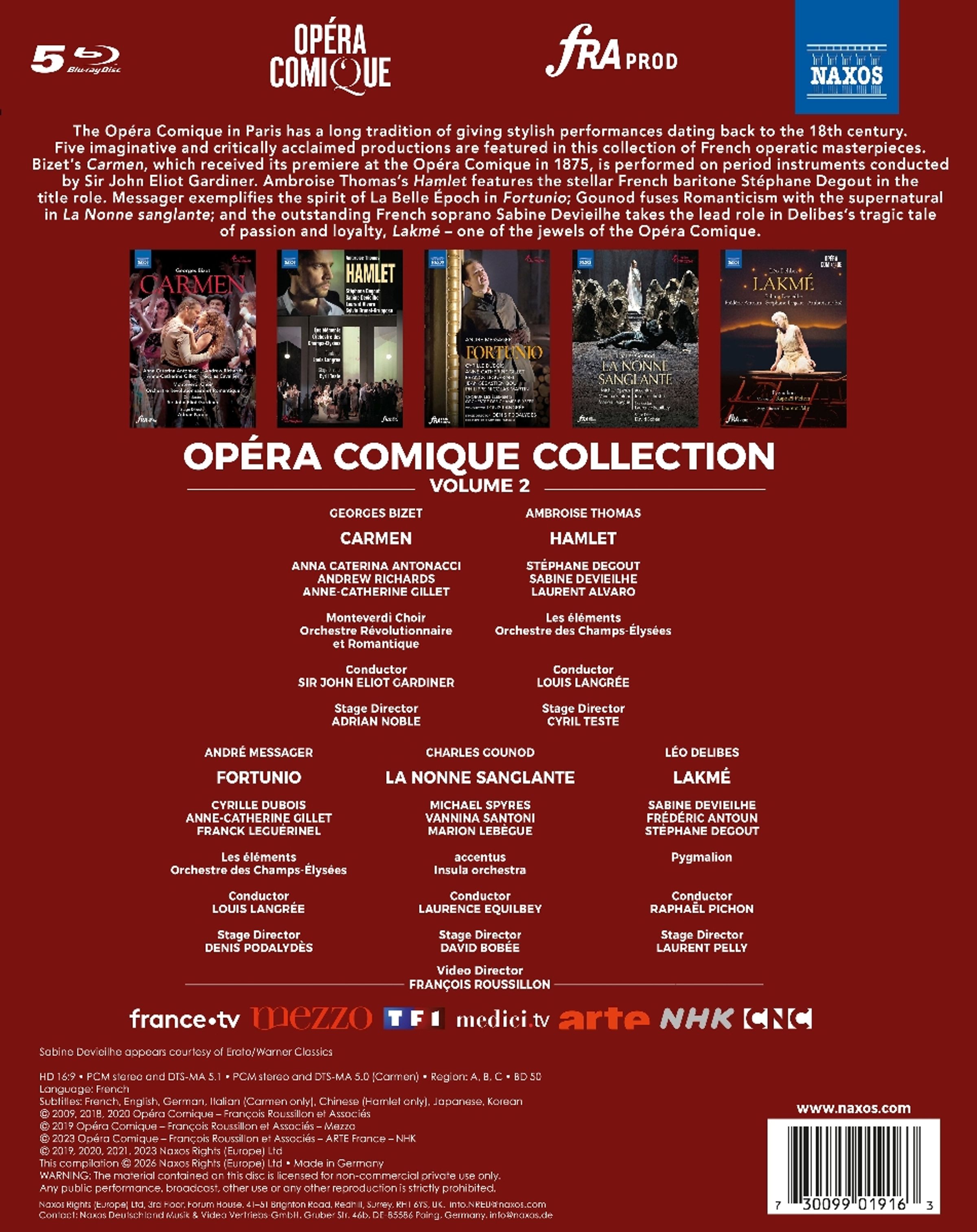Georges Bizet: Carmen (Eine Produktion der Opera Comique Paris 2009, Regie: Adrian Noble / Anna Caterina Antonacci, Andrew Richards, Anne-Catherine Gillet, Nicolas Cavallier, Orchestre Revolutionnaire et Romantique, John Eliot Gardiner) +Ambroise Thomas: Hamlet (Eine Produktion der Opera Comique Paris 2018, Regie: Cyril Teste / Sabine Devieilhe, Sylvie Brunet-Grupposo, Stephane Degout, Laurent Alvaro, Orchestre des Champs-Elysees, Louis Langree) +Andre Messager: Fortunio (Eine Produktion der Opera Comique Paris 2019, Regie: Denis Podalydes / Cyrille Dubois, Anne-Catherine Gillet, Franck Leguerinel, Jean-Sebastien Bou, Orchestre des Champs-Elysees, Louis Langree) +Charles Gounod: La Nonne Sanglante (Eine Produktion der Opera Comique Paris 2018, Regie: David Bobee / Michael Spyres, Vannina Santoni, Marion Lebegue, Jerome Boutillier, Accentus, Insula Orchestra, Laurence Equilbey) +Leo Delibes: Lakme (re des Champs-Elysees, Louis Langree) +Charles Gounod: La Nonne Sanglante (Eine Produktion der Opera Comique Paris 2022, Regie: Laurent Pelly / Sabine Devieilhe, Elisabeth Boudreault, Mireille Delunsch, Ambroisine Bre, Frederic Antoun, Stephane Degout, Pygmalion, Raphael Pichon)