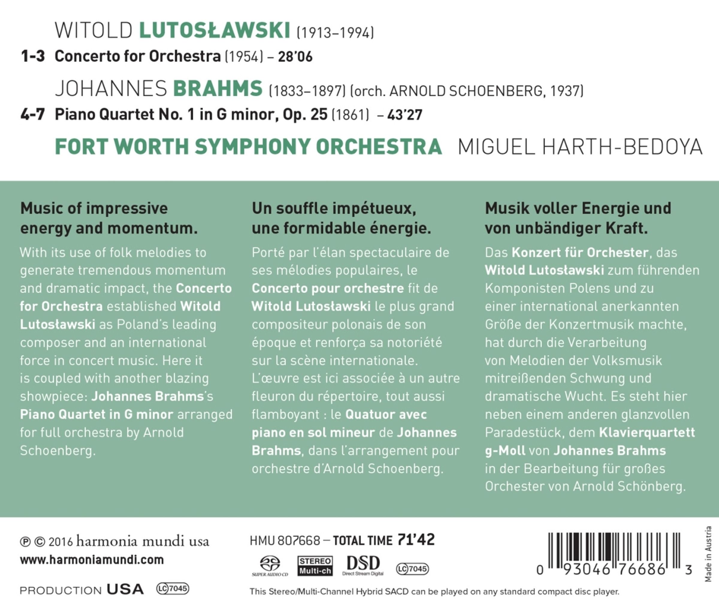 Der Grammy-nominierte Dirigent Miguel Harth-Bedoya leitet in seiner vierten Aufnahme für harmonia mundi das Fort Worth Orchestra in einem reinen Orchesterprogramm. Im Konzert für Orchester verarbeitet Witold Lutosławski Volkslieder seines Heimatlandes; das mitreißend schwungvolle und dramatische Werk machte Lutosławski zum führenden polnischen Komponisten des 20. Jahrhunderts.