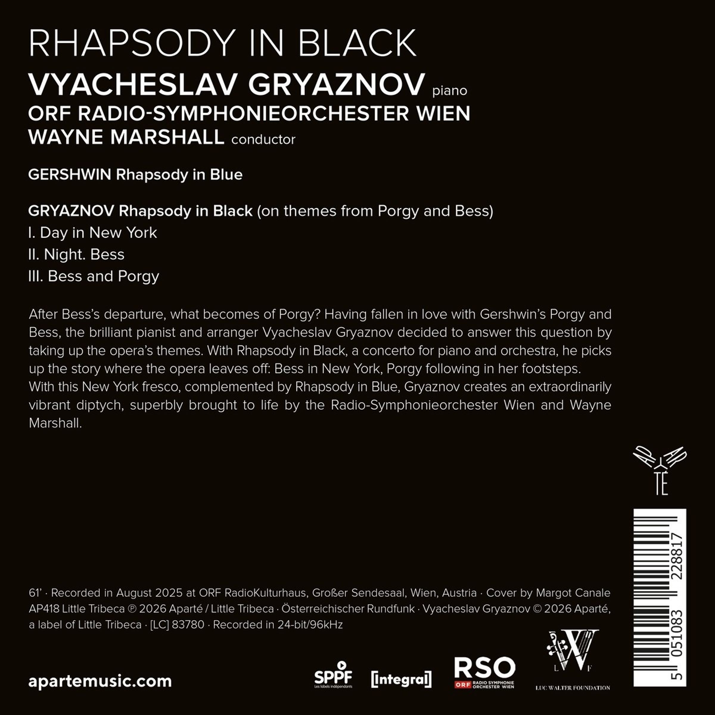 Was wird aus Porgy nach Bess’ Weggang? Der Pianist und Arrangeur Vyacheslav Gryaznov, der sich in Gershwins Porgy and Bess verliebt hatte, beschloss, diese Frage zu beantworten. Mit Rhapsody in Black, einem Konzert für Klavier und Orchester, knüpft er an die Geschichte der Oper an: Bess in New York, Porgy auf ihren Spuren. Weder Pastiche noch einfache Bearbeitung, knüpft Rhapsody in Black an Gershwins Vermächtnis an, indem es mitreißende Improvisationen, Big-Band-Klänge und poetische Balladen verbindet. Zusammen mit der Rhapsody in Blue, schaffen Gryaznov, das ORF Radio-Symphonieorchester Wien und Wayne Marshall ein lebendiges Diptychon.