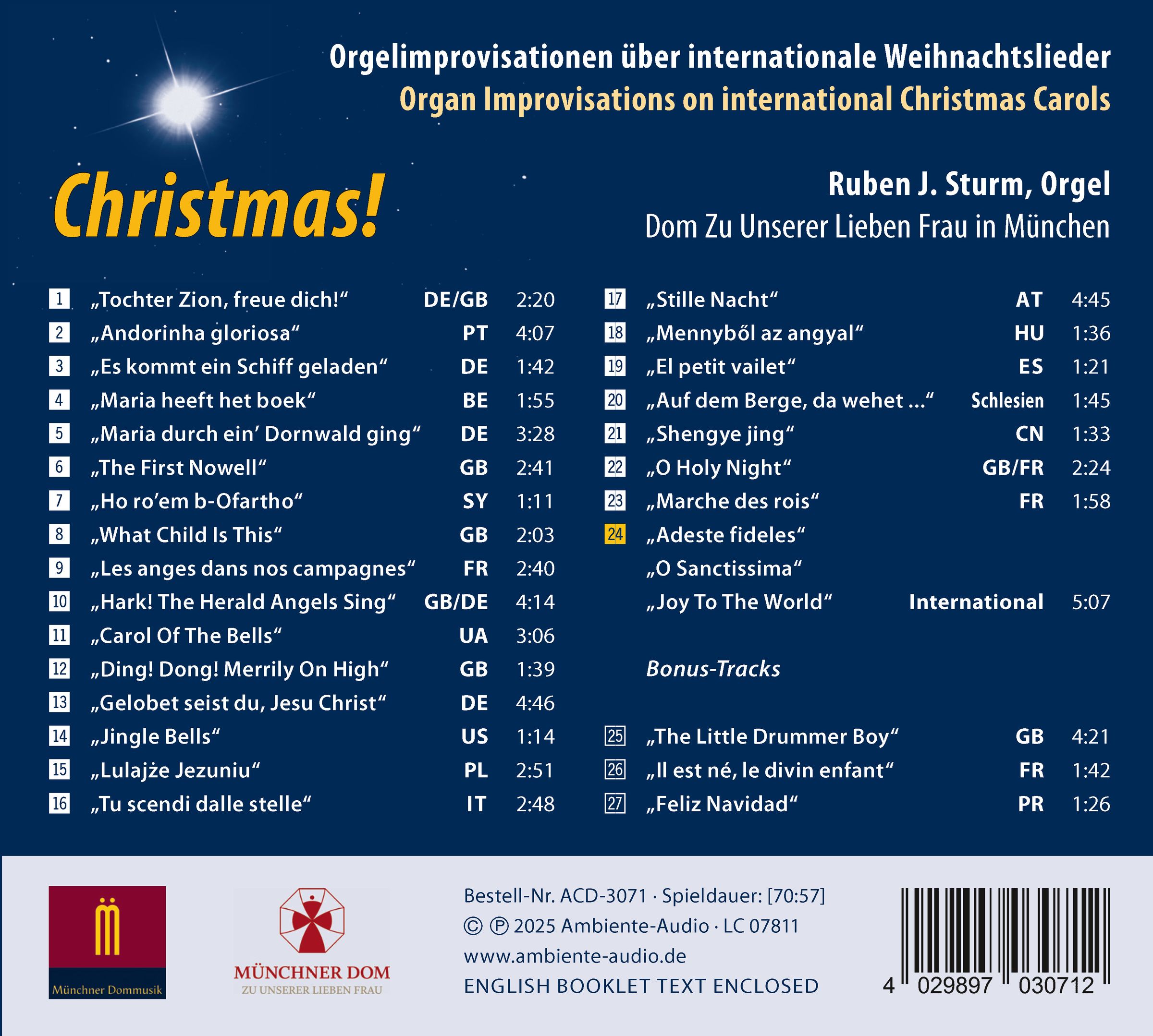 Mit seiner neuen CD-Einspielung präsentiert der Münchner Domorganist Ruben Sturm Orgelimprovisationen über Weihnachtslieder aus aller Welt in einem abwechslungsreichen Mix verschiedener Stile und Formen: Schlichte Arrangements einfacher Weisen sind dabei genauso vertreten wie mehrteilige Durchführungen, komplexere Satztechniken und symphonische Formen. Dabei steht die Vielfältigkeit im Vordergrund – sowohl bei den ausgewählten Liedthemen, als auch bei den verwendeten Improvisationstechniken. Die von Ruben Sturm nach der einstimmigen Melodievorlagen frei und ohne größere Vorbereitung improvisierten Stücke wollen zudem die immense Farbigkeit der Münchner Domorgel in all Ihren Facetten dokumentieren.