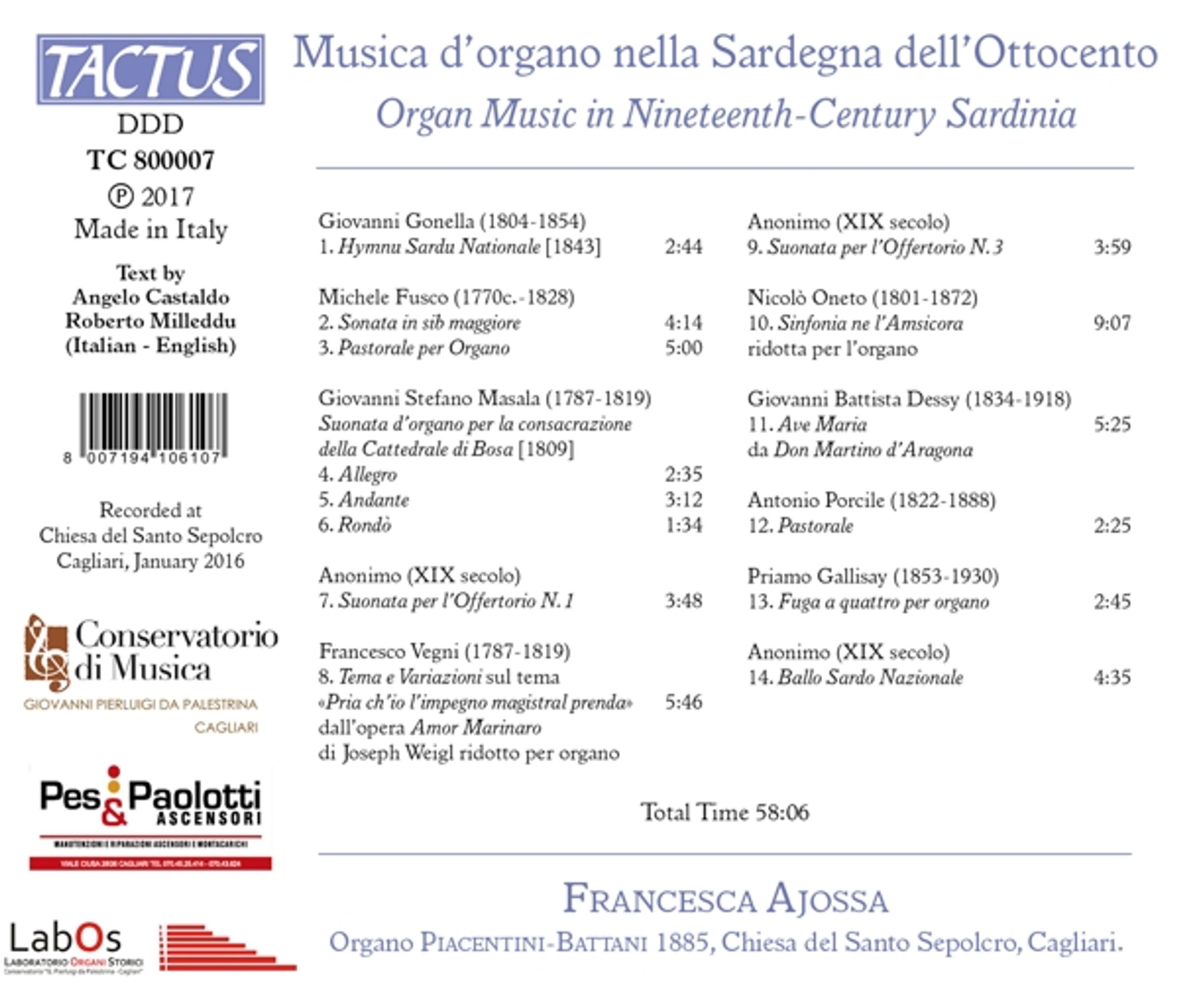 Die CD kann auch als integraler Bestandteil der sardischen Musik des 19. Jahrhunderts betrachtet werden, da keine anderen handschriftlichen oder gedruckten Quellen gefunden werden konnten. Das für die Aufnahme verwendete Instrument ist die Piacentini-Battani-Orgel von 1885 aus der Chiesa del Santo Sepolcro in Cagliari.
