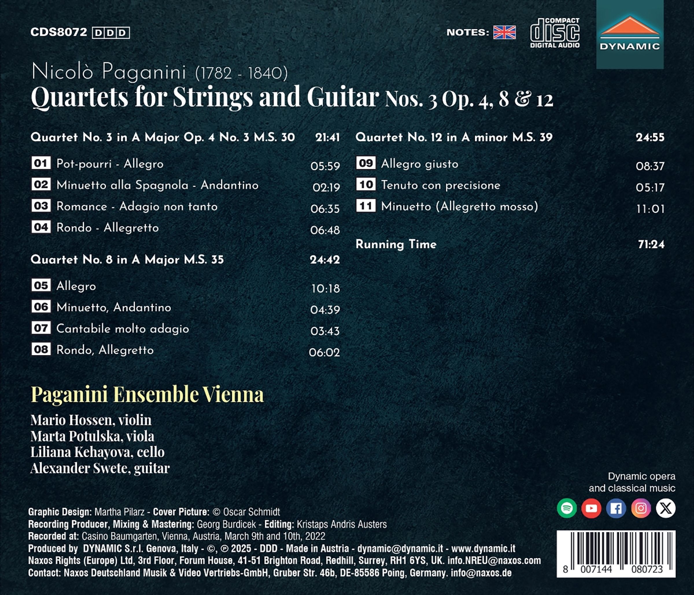 Von Nicolò Paganinis fünfzehn Quartetten mit Gitarre wurden nur sechs zu seinen Lebzeiten veröffentlicht. Sie stellen seine besten Kammermusikkompositionen dar, wie man in den drei Quartetten für Violine, Viola, Gitarre und Cello, op. 4, hören kann. Von diesen ist Nr. 3 in A-Dur ein Meisterwerk mit französischer Inspiration, sehr lyrisch und voller pikanter Einfälle, während das virtuose, fast konzertante Nr. 8 in A-Dur mit seinen Rossini-Anklangen perfekt seine brillante Quartettkomposition darstellt. Nr. 12 in a-Moll ist das sinfonischste' der drei Quartette, mit formaler Originalität, einem der bewegendsten langsamen Sätze Paganinis und seinem ernsthaftesten Finale. Die Stücke werden vom Paganini Ensemble Vienna aufgeführt, das sich seit einiger Zeit auf Paganini konzentriert. Zu Ehren ihrer Arbeit wurden sie zu Botschaftern der Europaischen Paganini-Route ernannt, einem Netzwerk, das Universitäten, öffentliche Einrichtungen und Vereine aus 12 europäischen Ländern verbindet und das kulturelle und musikalische Erbe Niccolò Paganinis fördert. Zwischen 2021 und 2024 trat das Ensemble in ganz Europa, Kanada und China an renommierten Veranstaltungsorten und Festivals auf, darunter das Auditorio Nacional de Música Madrid, der Musikverein und das Konzerthaus Wien, das Paganini Festival Genova und das Collingwood Music Festival in Kanada.
