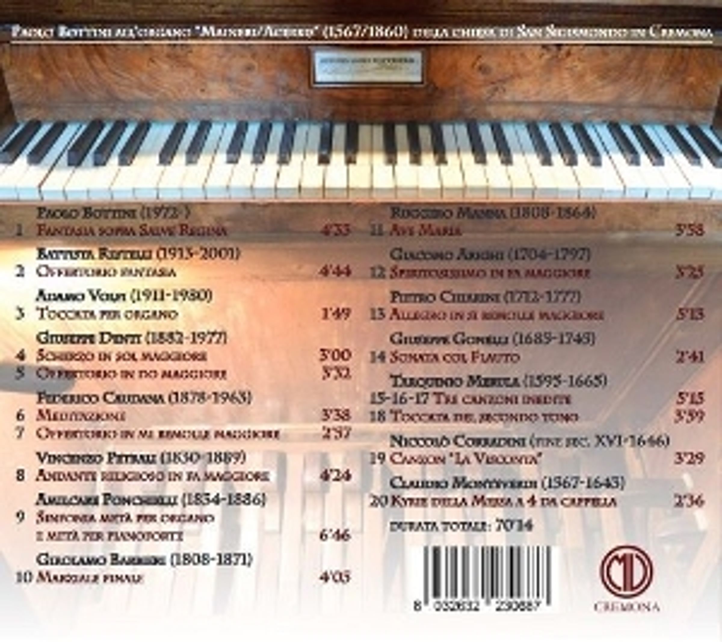 Das Label MVcremona hat sich seit jeher der Förderung des musikalischen Erbes der Stadt Cremona verschrieben. Dieses Album ist der wertvollen Maineri-Acerbi-Orgel der Kirche San Sigismondo gewidmet, einer wunderschönen Kirche etwas außerhalb der Stadt. Die ersten dokumentierten Nachrichten über den Bau dieser monumentalen Orgel stammen aus dem Jahr 1567, doch erst 1572 wurde sie in Betrieb genommen. Nach einem Eingriff im 18. Jahrhundert, bei dem ihre Klangstruktur teilweise verändert wurde, wurde sie 1860 vom Orgelbauer Luigi Vincenzo Acerbis restauriert. Er schuf die heutige Klangstruktur, in der alle originalen Pfeifen aus Metall und Holz aus dem 16. Jahrhundert erhalten geblieben sind. Dies macht das Instrument sehr vielseitig und für die Aufführung eines breiten musikalischen Repertoires geeignet. Der Cremoneser Organist Paolo Bottini, der bereits durch zahlreiche Aufnahmen zur Aufwertung anderer historischer Orgeln in Cremona beigetragen hat, präsentiert auf diesem Album eine Reihe von Stücken von Komponisten, die in der Region Cremona tätig waren. Den Anfang macht er selbst, dann folgen Werke bis zurück zu Claudio Monteverdi, der 1567 in Cremona geboren wurde, dem Jahr, in dem mit dem Bau der Orgel begann. Die Kirche und das Kloster San Sigismondo in Cremona werden von einem Orden von Ordensschwestern geleitet, weshalb die Maineri-Acerbi-Orgel nur für liturgische Zwecke genutzt wird. Auf diesem Album ist Klang dieser historischen Orgel nun in einem Repertoire von außergewöhnlicher stilistischer Vielfalt zu hören.