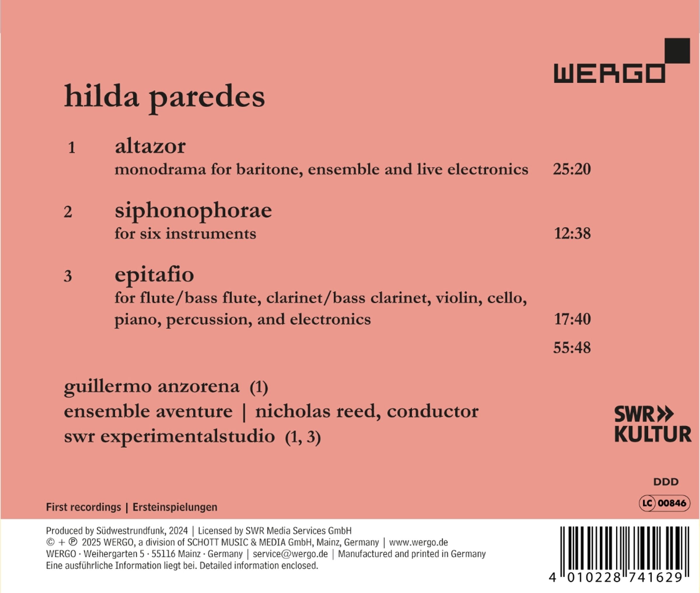 Neben Tradition und aktueller Lebenswirklichkeit in ihrer mexikanischen Heimat ist das Werk von Hilda Paredes, einer seit längerer Zeit in London lebenden Komponistin, reich an Bezügen zu literarischen und bildnerischen Werken ihrer Zeitgenossen und der heimischen Kulturgeschichte. In diesem Kontext steht auch das erste der Werke, die auf diesem Album versammelt sind, das Monodram "Altazor" für Bariton, acht Instrumentalisten in solistischer Besetzung und Elektronik, das auf dem Epos des chilenischen Dichters Vicente Huidobro, des Begründers des "Creationismo" basiert. Den in den Gedichtfragmenten dargestellten Zerfall von Bewusstsein und Sprache vollzieht die musikalische Semantik unter Einbezug eines breiten Spektrums an Instrumental- und Vokalbehandlungen nach. Zwei weitere Facetten ihres Schaffens führen die beiden Ensemblewerke vor Ohren: "Epitafio", das im familiären Kontext entstand, und "Siphonophorae", das seine Kompositionsidee und formale Gestaltung - über die Vermittlung eines Werks der Bildenden Kunst - einer faszinierenden Erscheinung aus dem Bereich der Meereswesen entlehnt. Paredes igoniert bewusst jede Trennung zwischen den Musikkulturen der nördlichen und südlichen Hemisphäre, der Alten und der Neuen Welt und schlägt immer wieder eine Brücke zwischen präkolumbischen Kulturen Mesoamerikas und der europäisch-amerikanischen Moderne. Die Komplexität ihrer Klangwelt wurzelt in dieser doppelten kulturellen Zugehörigkeit und speist sich aus den vielfältigen Anregungen beider Welten.