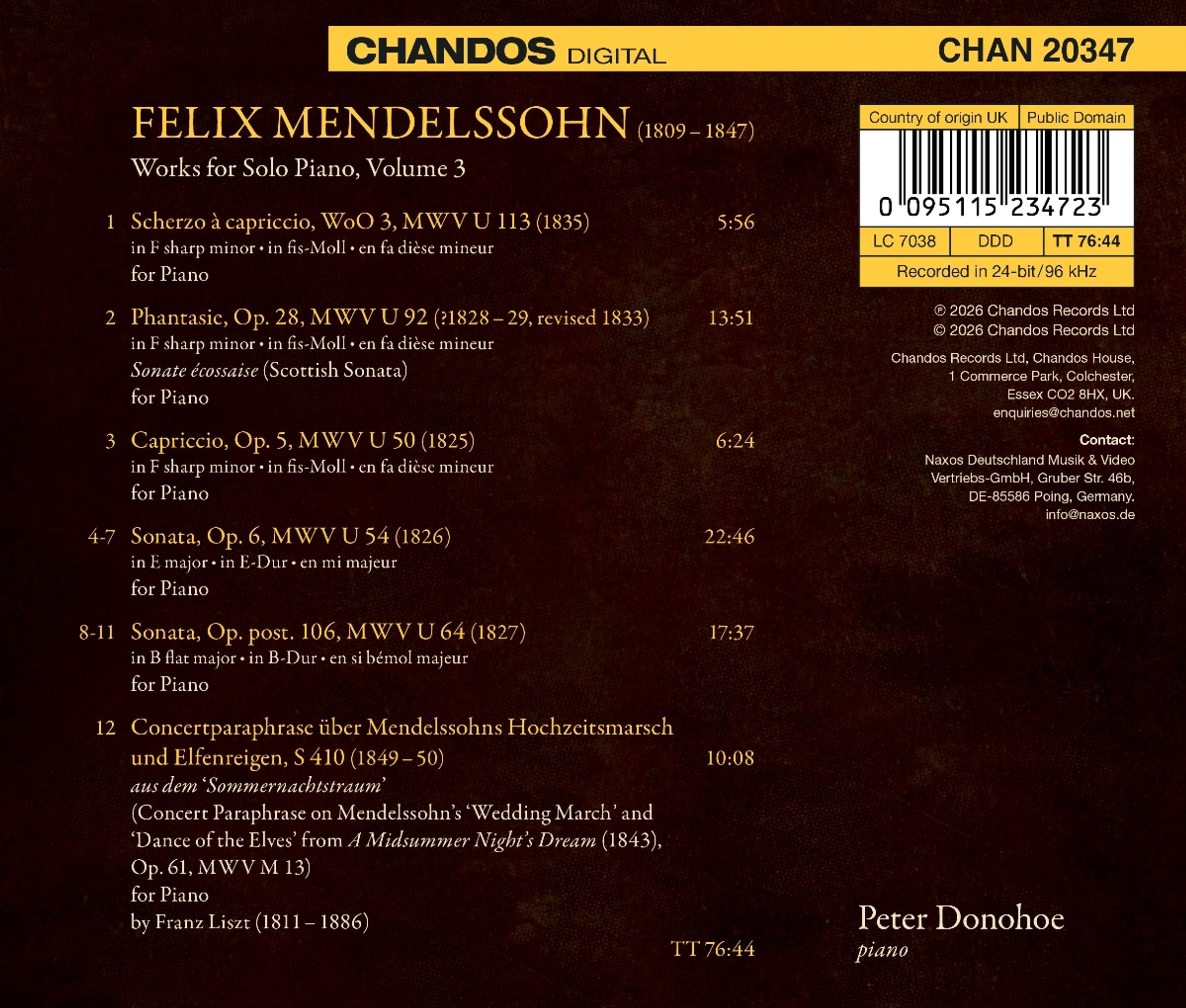 Alle hier eingespielten Werke entstanden zwischen 1825 und 1835, als Mendelssohn zwischen sechzehn und sechsundzwanzig Jahre alt war. Er verbrachte einen Großteil dieses Jahrzehnts auf Reisen, von Berlin über Weimar nach Paris, dann nach London und Schottland, bevor ihn eine Anstellung in Düsseldorf schließlich zur Ernennung zum städtischen Musikdirektor und Dirigenten des Gewandhausorchesters in Leipzig führte. Die Klaviersonate in E-Dur und die in B-Dur sowie die Phantasie (mit dem Untertitel „Sonate écossaise“) sind stark von Beethoven geprägt, zeigen aber auch Einflüsse von Weber, Hummel und Moscheles (dem die Phantasie gewidmet war). Die beiden kürzeren Werke (Scherzo à capriccio und Capriccio) zeigen vielleicht eine eher entspannte Seite des Komponisten, frei von den Zwängen der Sonatenform. Liszts virtuose Überarbeitung von Themen aus Ein Sommernachtstraum rundet das Programm ab.