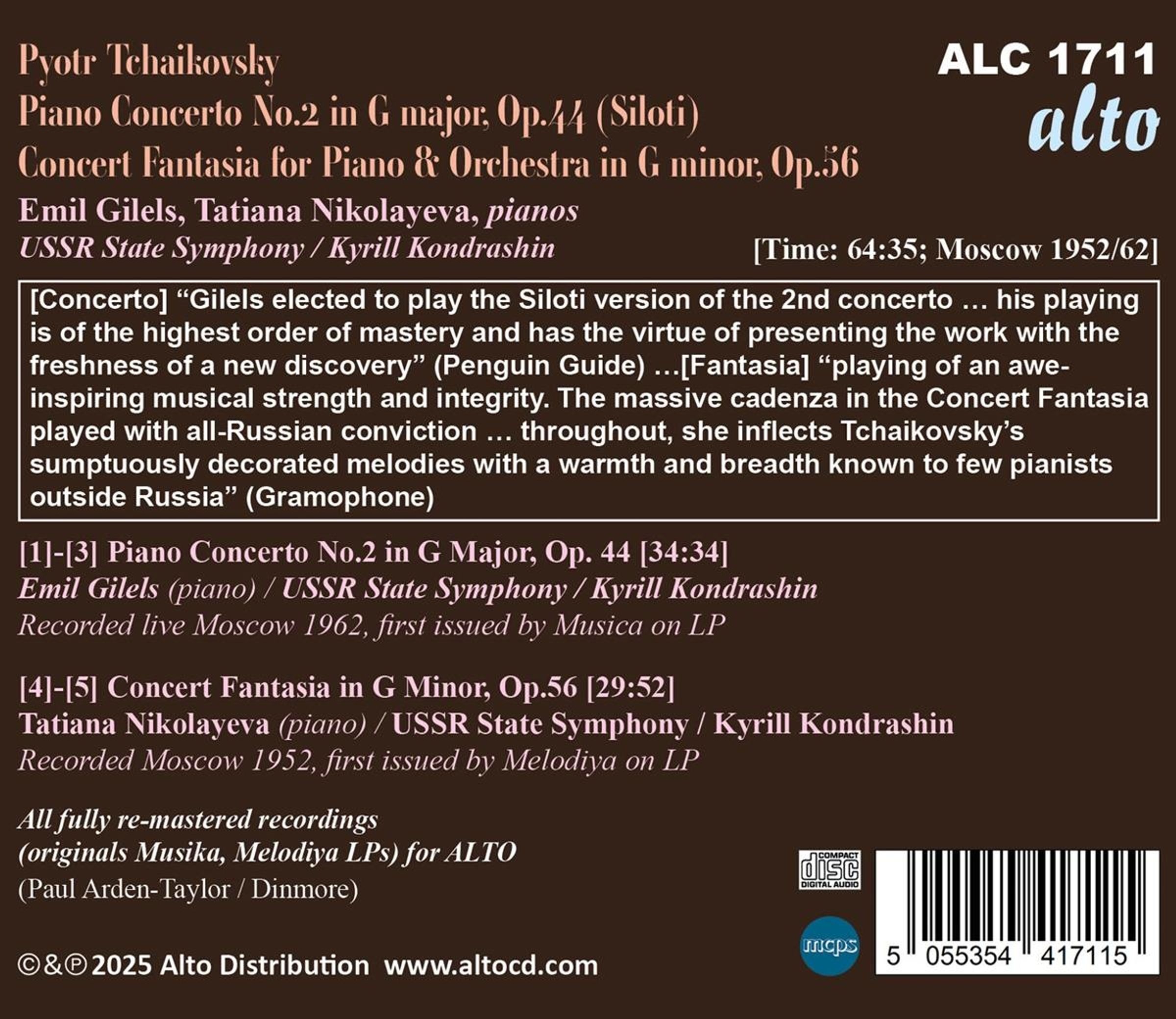 Alto ist stolz darauf, bahnbrechende Aufnahmen von Tschaikowskys Meisterwerken zweier legendärer russischer Pianisten, Emil Gilels und Tatiana Nikolayeva, mit dem Staatssinfonieorchester der UdSSR unter der Leitung des großen Kirill Kondrashin präsentieren zu dürfen. Diese neue Produktion enthält Emil Gilels in Tschaikowskys Klavierkonzert Nr. 2 in einer Live-Aufnahme von 1962, die erstmals von Musica auf LP veröffentlicht wurde, sowie Tatiana Nikolayeva in der Konzertfantasie in g-Moll, Op. 56, aus Melodias Moskauer Aufnahmen von 1952. Beide wurden von Toningenieur Paul Arden-Taylor liebevoll aus den Originalquellen für Alto remastered und restauriert.