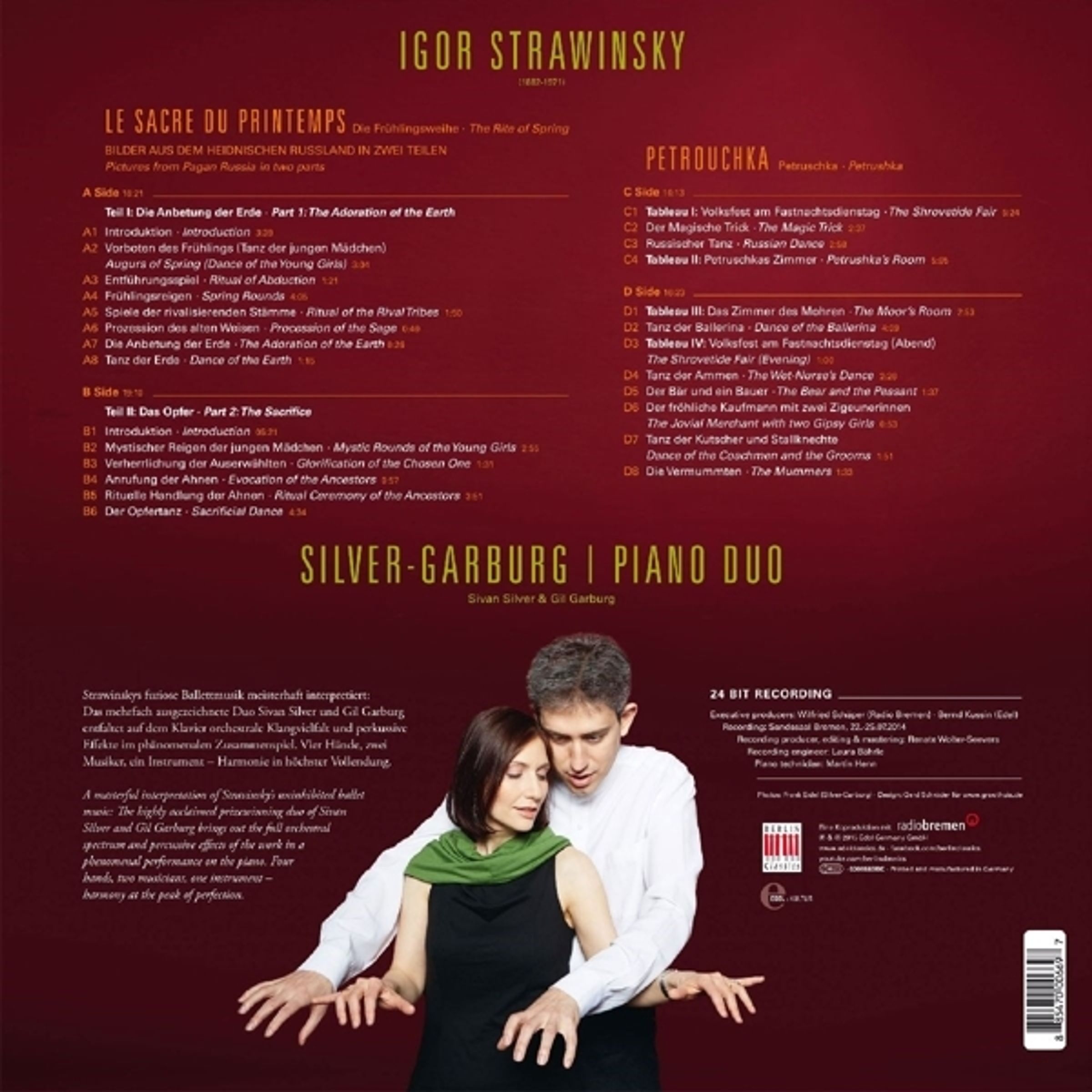 Mit der Einspielung von Strawinskis hochvirtuosen Werken »Le Sacre du Printemps« und »Petruschka« stellen sich die beiden Musiker einer großen Herausforderung. Strawinski, der diese, für das Ballett konzipierte, Musik sowohl für Orchester als auch für vier Hände schrieb, fordert viel von den Pianisten. So muss ihre Interpretation stets dem Vergleich mit der Orchesterversion standhalten. Aber damit nicht genug. Strawinskis Werke treiben die Anforderungen an Instrument und Künstler auf die Spitze: kontrast- und klangfarbenreich, rhythmisch rasant und komplex ist seine Musik, sie fordert Kraft und ein hoch differenziertes Spielvermögen auf kleinstem Raum. Eine Aufgabe, die das Piano- Paar herausragend meistert. Sie entlocken dem Klavier das Klangspektrum eines Orchesters und die Rhythmik eines Schlagzeugs und dies in einer Weise, dass zudem der Eindruck entsteht, als spiele nur eine Person.