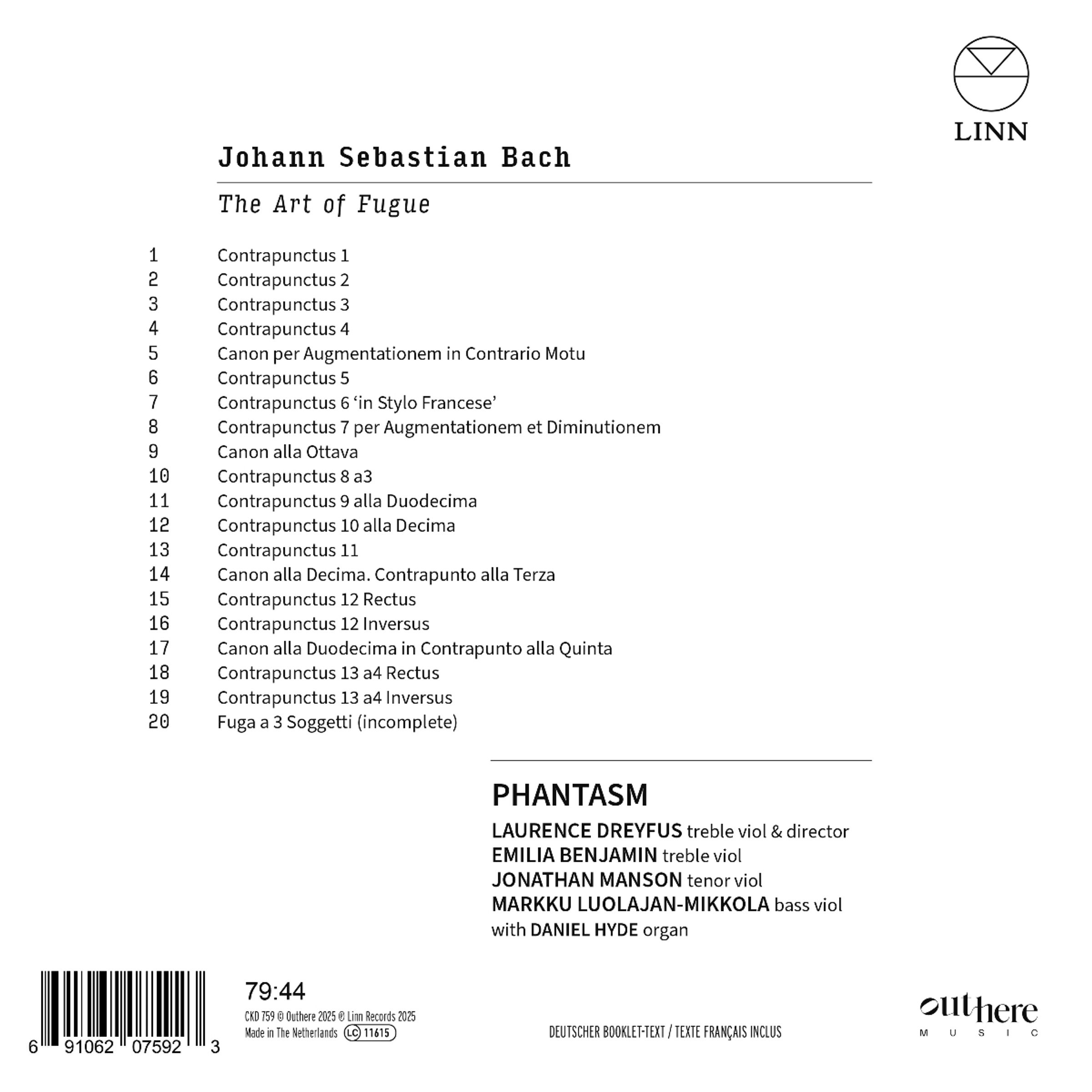Die Kunst der Fuge ist Bachs letzte Komposition und eine seiner anspruchsvollsten. Auf diesem Album zeigen das Gamben-Consort Phantasm und sein Leiter Laurence Dreyfus die Fülle an verborgener Schönheit in Bachs Opus magnum, das wohl den Höhepunkt des Fugen-Genres darstellt. Die fehlende Vorgabe der Instrumente erlaubt auch eine Wiedergabe auf Gamben, wie sie hier aufgenommen wurde. Das Werk ist voll von reichem Kontrapunkt und dynamischer Konversation zwischen den Stimmen und kann zu Recht einen Platz im Consort-Repertoire beanspruchen. Bach schuf einen fein gezeichneten und kontrastreichen Zyklus von Fugen und Kanons, der voller Entdeckungen und Überraschungen ist. Phantasm begibt sich mit The Art of Fugue auf die (unvollendete) Entdeckungsreise eines leidenschaftlichen Komponisten, dessen Erfindungsdrang keine Grenzen kennt. Vier Sätze des Zyklus’ interpretiert der Organist Daniel Hyde und rundet dieses Album ab, das eine Fortsetzung der hochgelobten Well-Tempered Consort-Reihe von Phantasm bildet.