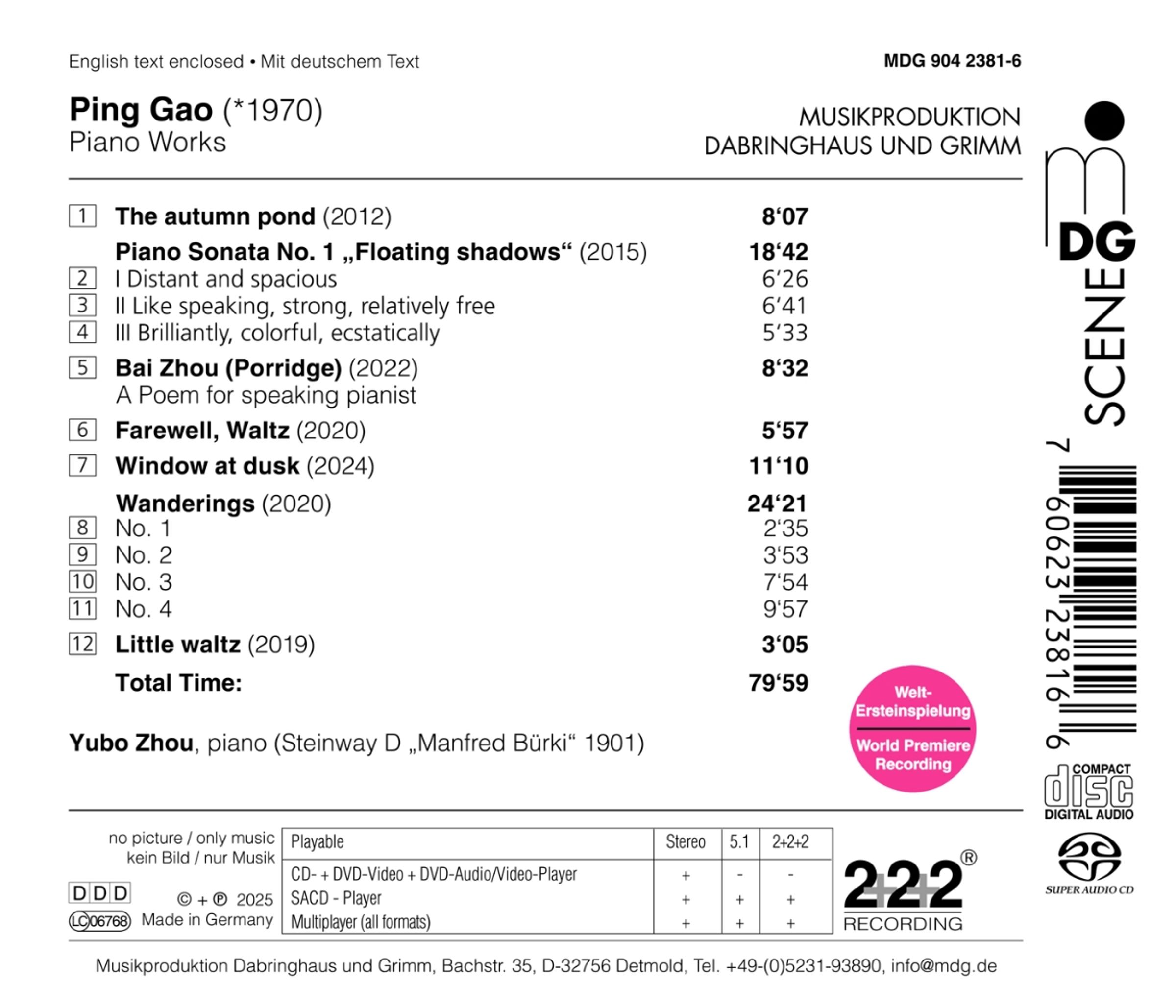 The Autumn Pond; Klaviersonate Nr. 1 "Floating Shadows"; Bai Zhou (Porridge - A Poem for speaking Pianist); Windows at Dusk; Wanderings Nr. 1-4; Little Waltz
