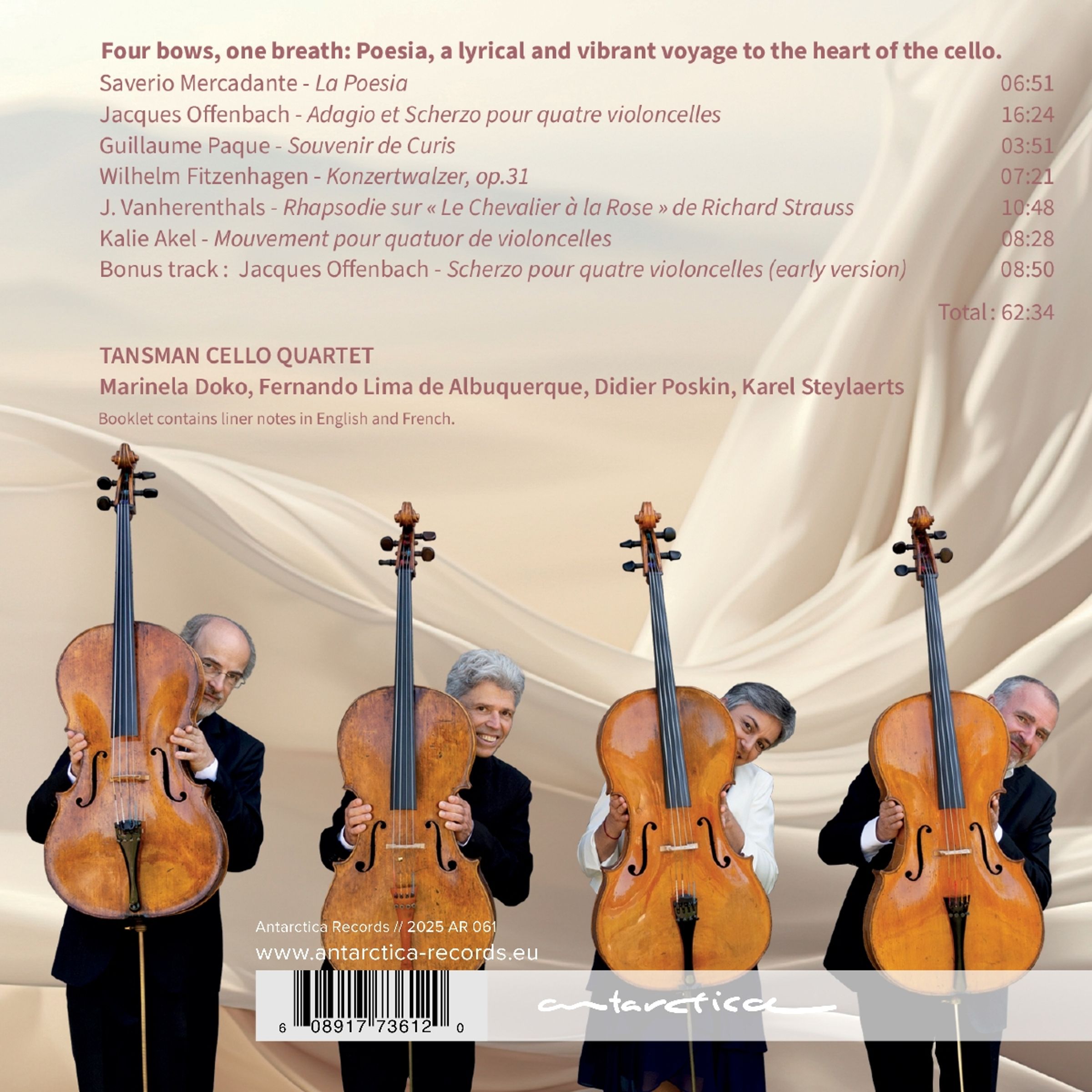 "Zehn Jahre nach ihrer ersten Aufnahme und Veröffentlichung beim Label Antarctica kehrt das Tansman Cello Quartet mit „Poesia“ zurück, einem neuen Album, das die 20. Ausgabe des Festivals Violoncelles en Folie feiert. Mit diesem lyrischen Repertoire, das sich an der Oper und der Romantik orientiert, zollt das Quartett der sanglichen Stimme des Cellos Tribut. Vom Belcanto des raffinierten, aber wenig bekannten Opernkomponisten Saverio Mercadante bis zur extravaganten „Rhapsodie über Themen aus Richard Strauss' Der Rosenkavalier“ von Jacques Vanherenthals erinnert jedes Stück an die Welt des Gesangs, mal zurückhaltend, mal überschwänglich. Ebenfalls zu hören sind der elegante und virtuose Humor von Jacques Offenbach mit einer unveröffentlichten Aufnahme der Originalfassung seines Scherzos für Celloquartett (in der Jean-Christophe Keck Edition), der brillante Walzer von Wilhelm Fitzenhagen, dem berühmten Widmungsträger von Tschaikowskis Rokoko-Variationen, und die Nostalgie des belgischen Komponisten Guillaume Paque mit seinem „Souvenir de Curis“. Den Abschluss bildet „Movement for Cello Quartet“ (2013) der brasilianischen Komponistin Kalie Akel, in dem das Quartett in schwingenden, traumhaften Rhythmen voller Klangfarben singt."