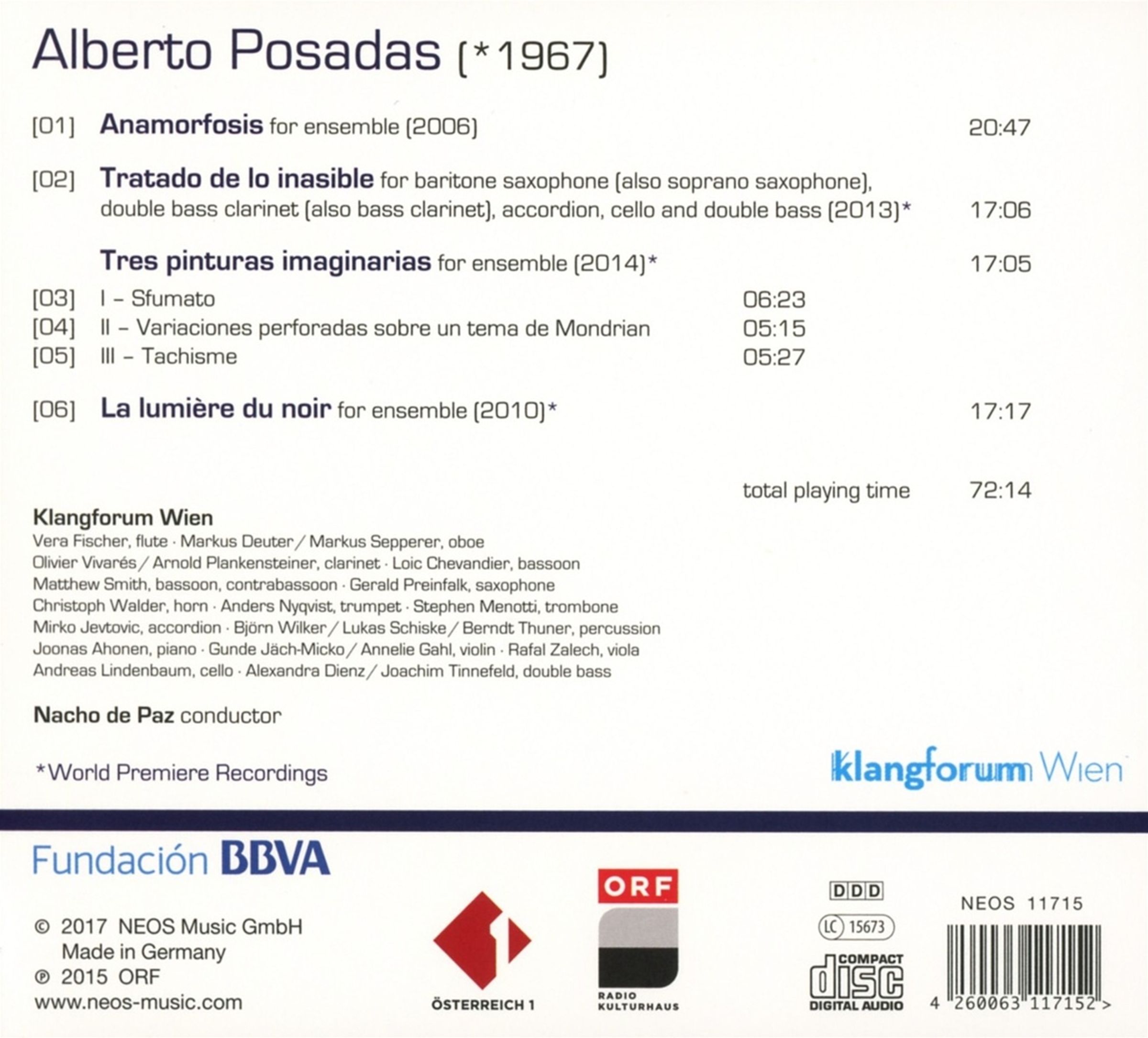 Anamorfosis für Ensemble; Tratado de lo inasible für Saxophon, Klarinette, Akkordeon, Cello & Kontrabass; Tres pinturas imaginaris für Ensemble; La lumiere du noir für Ensemble