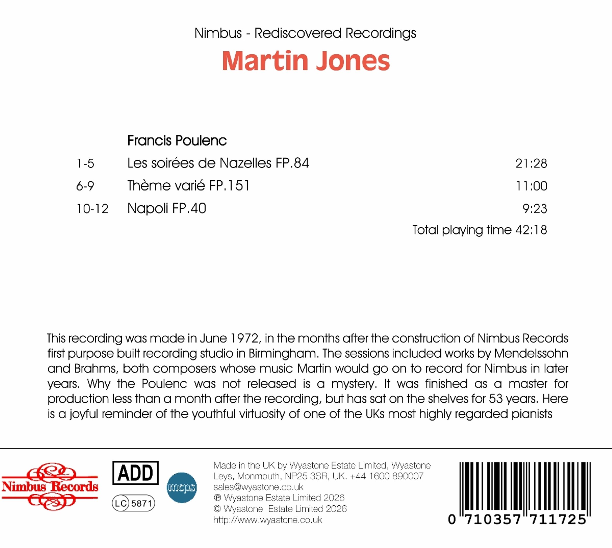 Diese Aufnahme entstand im Juni 1972, wenige Monate nach der Fertigstellung des ersten eigens für diesen Zweck gebauten Aufnahmestudios von Nimbus Records in Birmingham. Die Sessions umfassten Werke von Felix Mendelssohn und Johannes Brahms, zwei Komponisten, deren Musik Martin in späteren Jahren für Nimbus aufnehmen sollte. Warum das Werk von Francis Poulenc nicht veröffentlicht wurde, ist ein Rätsel. Es wurde weniger als einen Monat nach der Aufnahme als Master für die Produktion fertiggestellt, lag aber 53 Jahre lang ungenutzt in den Regalen. Martin Jones Martin Jones ist seit seinem internationalen Durchbruch im Jahr 1968, als er den Dame-Myra-Hess-Award erhielt, einer der angesehensten Solopianisten Großbritanniens. Im selben Jahr gab er sein Debüt in London in der Queen Elizabeth Hall und in New York in der Carnegie Hall und ist seitdem auf beiden Seiten des Atlantiks für Recitals und Konzertauftritte gefragt. Er ist ein produktiver Aufnahmekünstler und zu seinen zahlreichen großen Projekten gehören die gesamten Soloklavierwerke von Felix Mendelssohn, Johannes Brahms, Claude Debussy, Percy Grainger, Igor Strawinsky, Erich Wolfgang Korngold, Karol Szymanowski, Enrique Granados, Carlos Guastavino, Federico Mompou, Ernesto Halffter Escriche, Joaquin Nin, Has Gál, Jean Françaix, Jean Roger-Ducasse und Alan Richardson.
