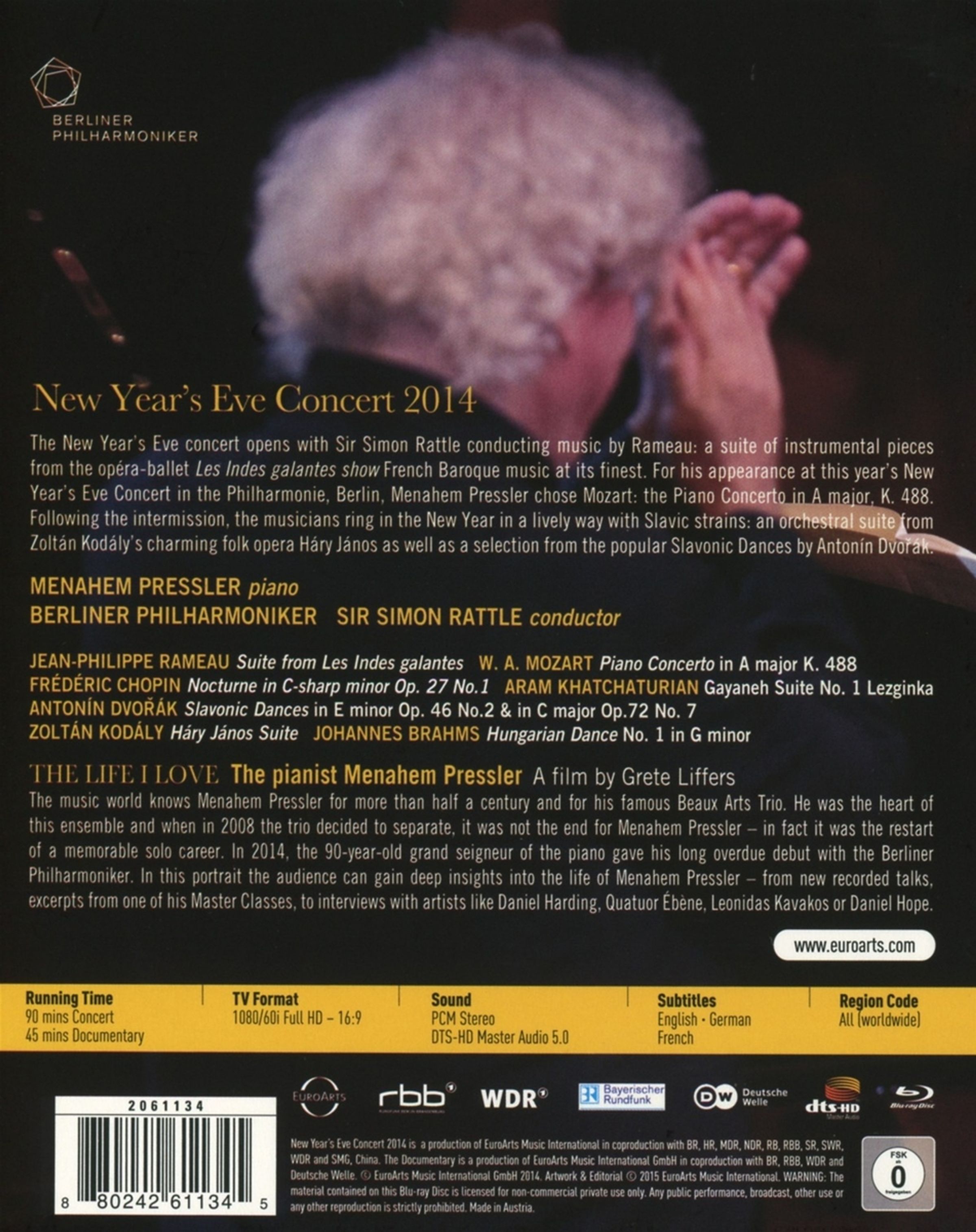Im Laufe seines Lebens war Menahem Pressler Solist, Ehemann und Vater, Lehrer, und hat – das nur am Rande – eines der berühmtesten und geachtetsten Kammermusikensembles des letzten Jahrhunderts gegründet, das Beaux Arts Trio. Ihm sind zahlreiche Auszeichnungen verliehen worden – darunter einer von nur fünf Gramophone Awards für das Lebenswerk aus den letzten 50 Jahren – und doch dürfen wir noch auf vieles gespannt sein, so Pressler selber: “There is no such thing as a lifetime achievement award. The only time that award can be made is when they put you in the grave and you have done all that can be done. I have always worked very, very hard and I still work very, very hard. I’ve never given a thought to working less.“ 2014 gab Pressler sein Debüt mit den Berliner Philharmonikern – im Alter von über 90 Jahren ein wahrlich lang erwartetes Ereignis. Und weil besagtes Konzert schlicht phänomenal war, luden Sir Simon Rattle und das Orchester ihn als Solist zu ihrem alljährlichen Silvesterkonzert, wo er Mozarts Klavierkonzert in A-Dur spielte. Diesen Grand-Seigneur auf der Bühne zu erleben, kann wohl nur als Ehrfurcht gebietend bezeichnet werden. Und Ehrfurcht gebietend ist es ebenfalls, zu sehen, dass hinter dem formidablen Musiker ein ebenso formidabler Mensch steht. In der Dokumentation The Life I Love – ebenfalls in dieser Veröffentlichung erhalten – folgt die Kamera Pressler in Probenräume, Meisterklassen und Konzertsäle. Sie trifft seine Freunde und Zeitgenossen, und natürlich kommt auch Pressler selber zu Wort. Zusammen ergibt dies ein berührendes Portrait, welches einen tiefen Einblick in das Leben dieses außergewöhnlichen Künstlers erlaubt.