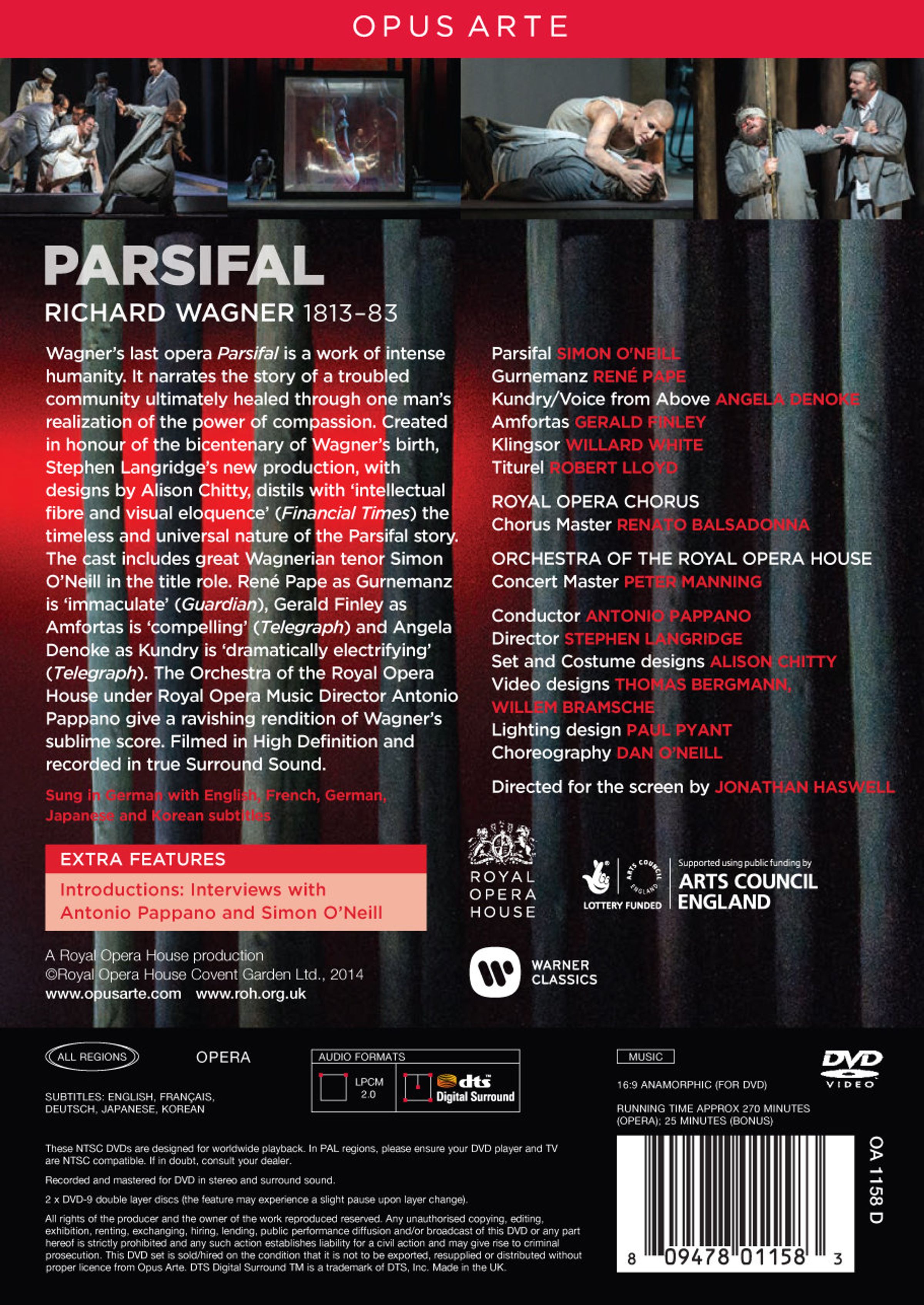 Der große Wagner-Tenor Simon O’Neill füllt die Titelrolle in jeglicher Beziehung prächtig aus, geradezu »makellos« (Guardian) gibt René Pape den Gurnemanz, Gerald Finnley ist als Amfortas »überwältigend« (Telegraph) und Angela Denoke sehen wir als »mitreißende« (Telegraph) Kundry.