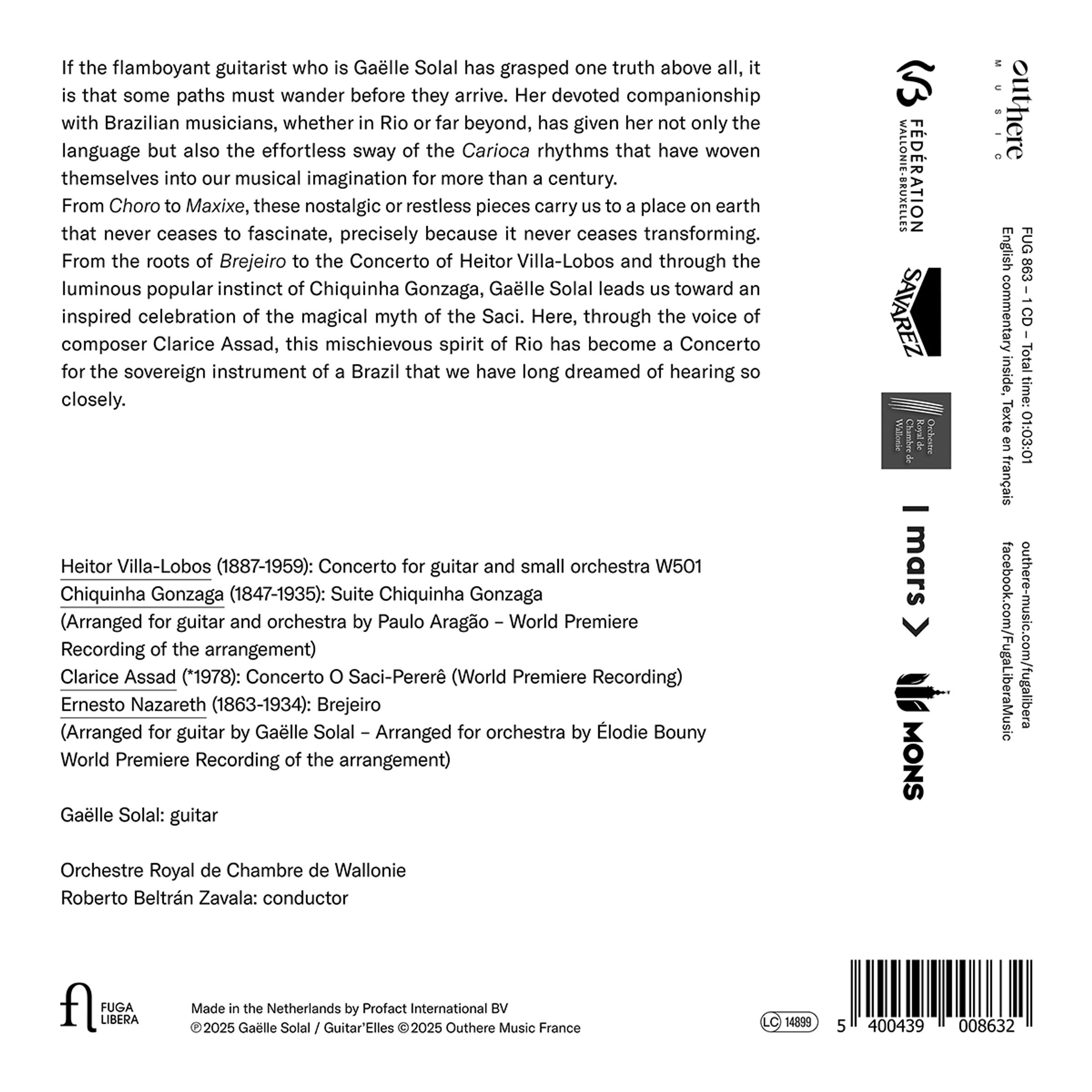 Wenn die extravagante Gitarristin Gaëlle Solal vor allem eine Wahrheit begriffen hat, dann die, dass manche Wege erst gewunden sein müssen, bevor sie ans Ziel führen. Ihre enge Zusammenarbeit mit brasilianischen Musikern, sei es in Rio oder weit darüber hinaus, hat ihr nicht nur die Sprache vermittelt, sondern auch die mühelose Leichtigkeit der Carioca-Rhythmen, die seit mehr als einem Jahrhundert unsere musikalische Vorstellungskraft prägen. Von Choro bis Maxixe entführen uns diese nostalgischen oder lebhaften Stücke an einen Ort auf der Erde, der uns immer wieder fasziniert, gerade weil er sich ständig verändert. Von den Wurzeln des Brejeiro über das Konzert von Heitor Villa-Lobos bis hin zum leuchtenden populären Instinkt von Chiquinha Gonzaga führt uns Gaëlle Solal zu einer inspirierten Feier des magischen Mythos des Saci. Hier, durch die Stimme der Komponistin Clarice Assad, ist dieser schelmische Geist von Rio zu einem Konzert für das herausragende Instrument Brasiliens geworden, von dem wir schon lange geträumt haben, es so hautnah zu hören.