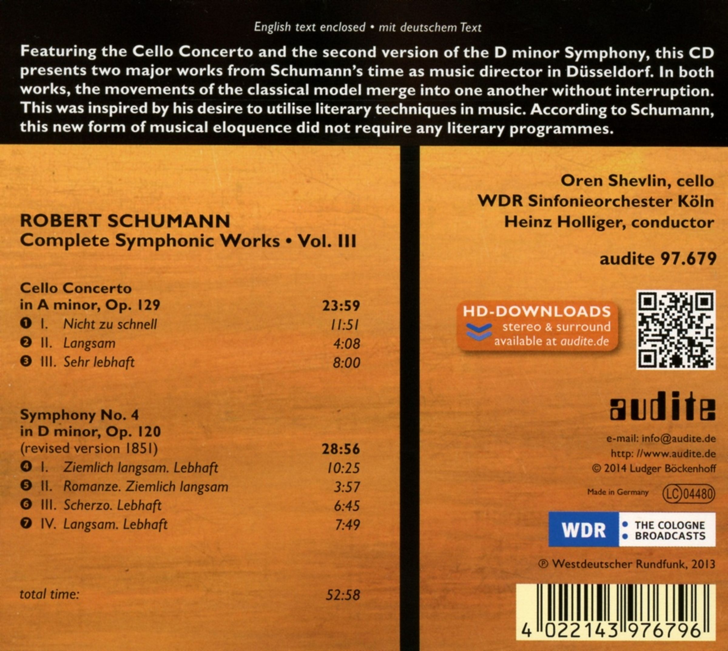 Mit dem Violoncellokonzert und der zweiten Fassung der d-Moll-Symphonie enthält diese CD zwei Hauptwerke aus Schumanns Zeit als Düsseldorfer Musikdirektor. In beiden lässt er die Sätze des klassischen Formmodells ohne Unterbrechung ineinander übergehen. Der Impuls dazu entsprang seinem Wunsch, Gestaltungsformen der Literatur auch für die Musik zu nutzen. Für diese neue Art ihrer Beredtheit brauche die Tonkunst nach seiner Auffassung keine literarischen Programme.