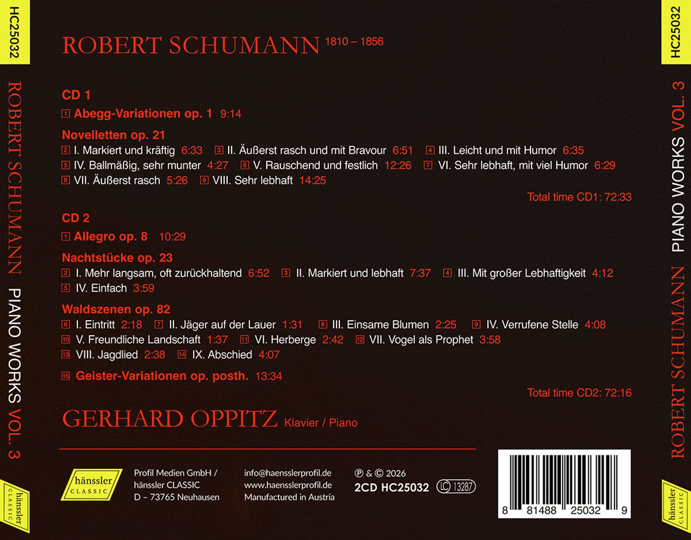 Schumanns Klaviermusik – poetisch, autobiografisch, jenseits der Konvention. Robert Schumanns Klaviermusik, die Gerhard Oppitz erneut in besonderer Werk-Konstellation interpretiert, bricht mit romantischen Idealen und schöpft aus Literatur, Poesie und Biographie.