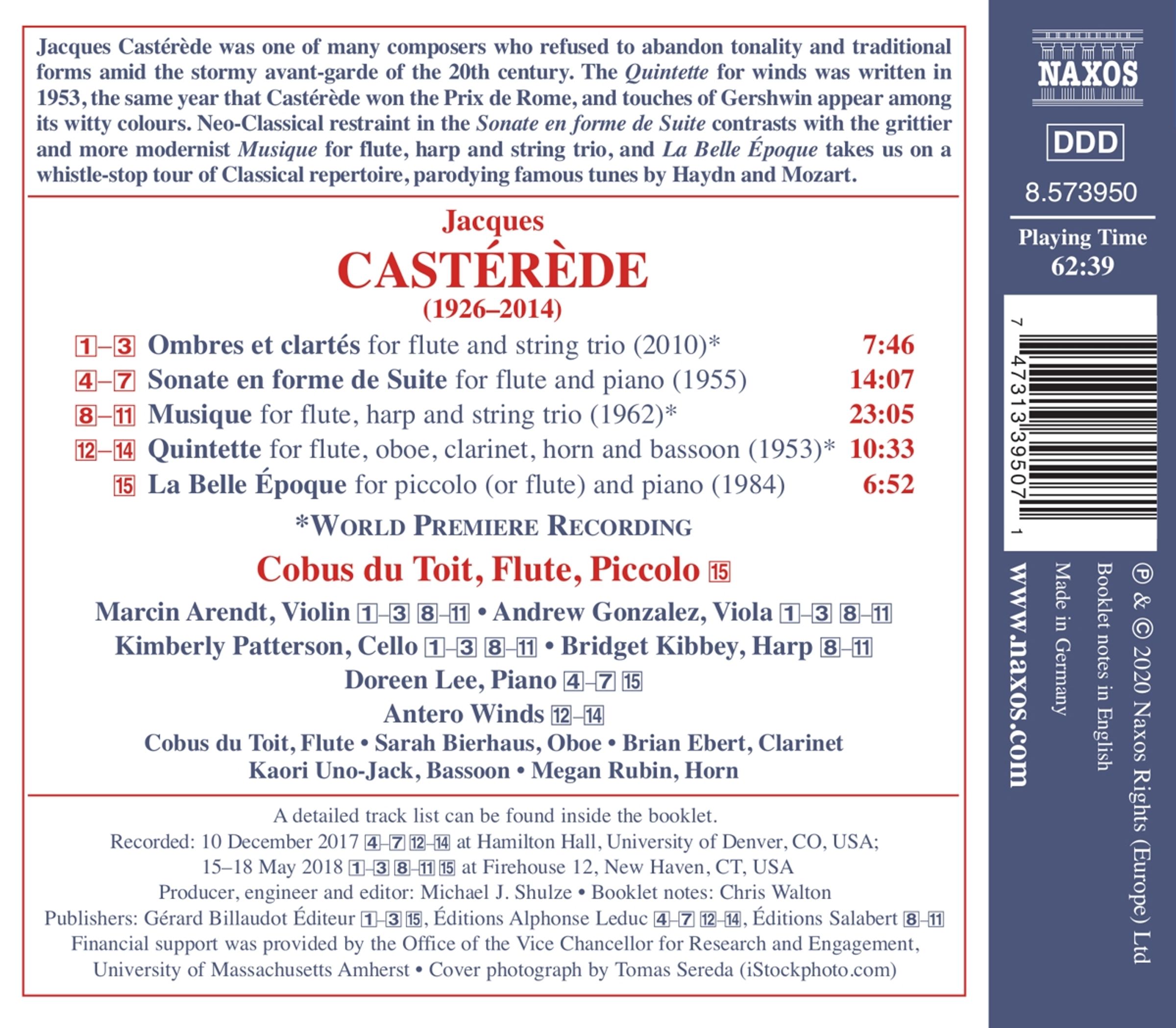 Ombres et clartes für Flöte & Streichtrio; Sonate en forme de Suite für Flöte & Klavier; Musique für Flöte, Harfe & Streichtrio; Quintett für Flöte, Oboe, Klarinette, Horn & Fagott; La Belle Epoque für Flöte & Klavier