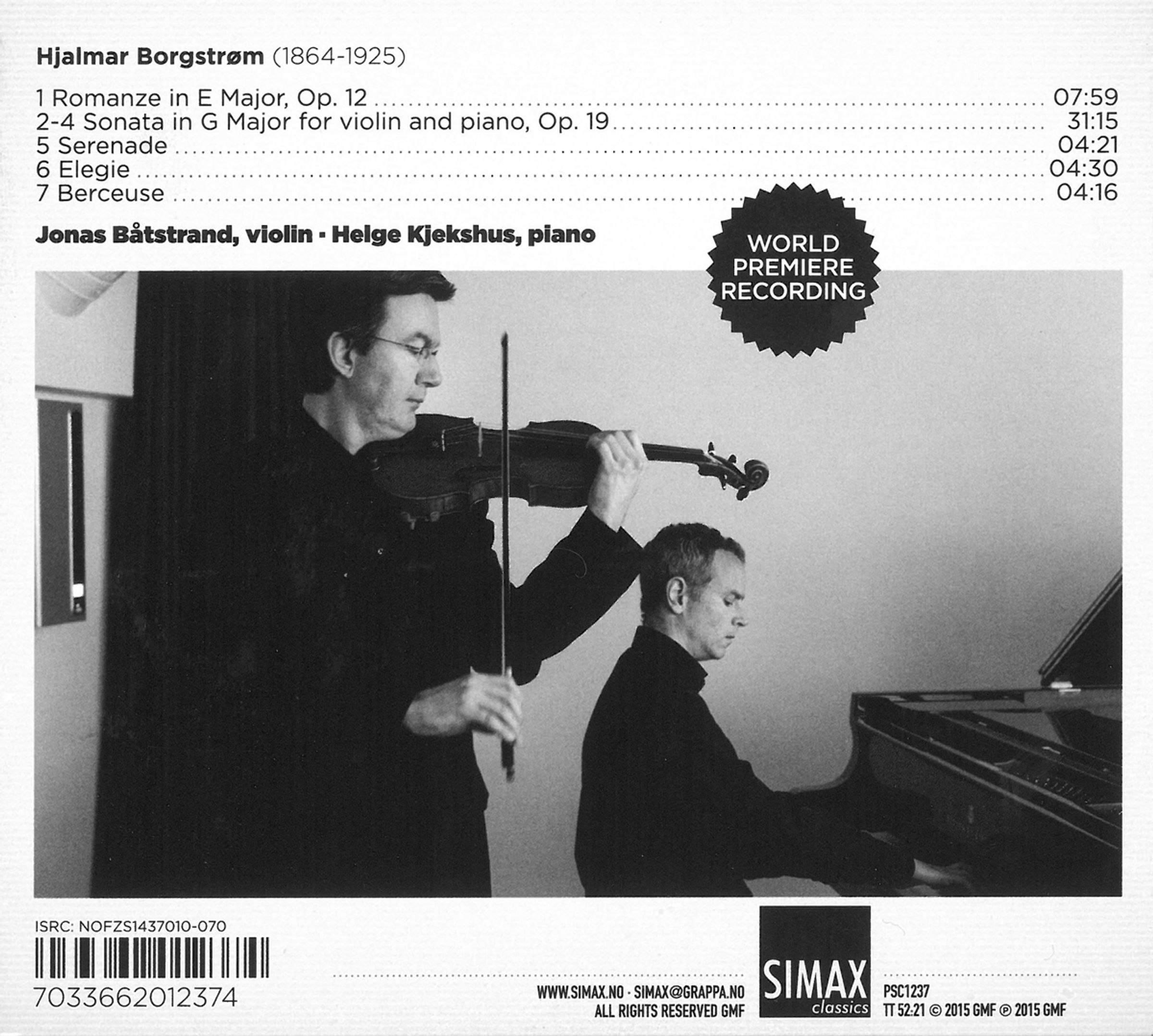 Hjalmar Borgstom besaß eine bemerkenswerte Begabung als Melodiker, und sein Ruf wurde durch die Oper »Thora aus Rimol« (PSC1230) und das Violinkonzert und die symphonischen Dichtungen (PSC1311) bestätigt. Borgstroms Violinsonate in G-Dur, op. 19, wurde am 28. November 1906 in Christiania mit dem Geiger Gustav Lange und Amalie Borgstrom am Klavier uraufgeführt.