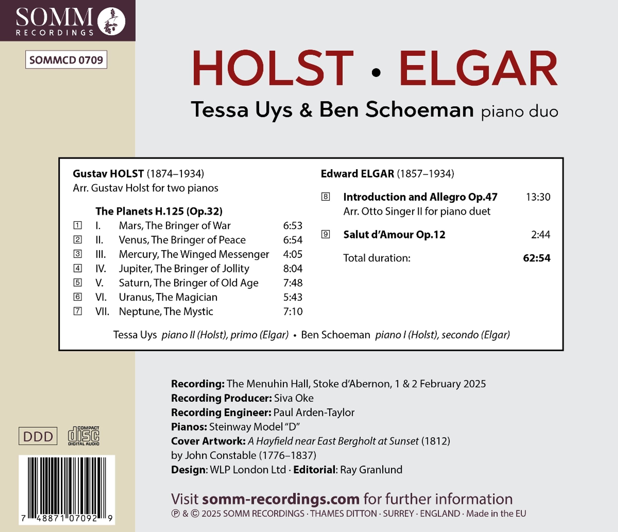 In den frühen 1910er Jahren interessierte sich Holst für Astrologie und hatte die Idee zu einer Orchestersuite, die auf den einzelnen Planeten des Sonnensystems basiert. Ursprünglich komponierte er The Planet s auf dem Klavier, wobei er das Instrument in seinem neu gebauten, schallisolierten Raum im Musikflügel der St Paul's Girls School sowie das Klavier in seinem Haus in Thaxted verwendete. Diese Fassung für vier Hände und zwei Klaviere wurde von zwei seiner Kolleginnen an der St. Paul's School, Vally Lasker und Nora Day, komponiert, die als Amanuensen fungierten, da Holst zeitweise an einer schmerzhaften Nervenentzündung in seiner rechten Hand litt. Nach dem durchschlagenden Erfolg der orchestrierten Version von The Planets wurde die ursprüngliche Partitur des Klavierduetts übersehen, obwohl sie schließlich 1949-51 separat veröffentlicht wurde. Im Jahr 1979 gab Holsts Tochter Imogen die komplette Bearbeitung für zwei Klaviere in einem Band neu heraus, und Tessa Uys und Ben Schoeman spielen diese Version hier.