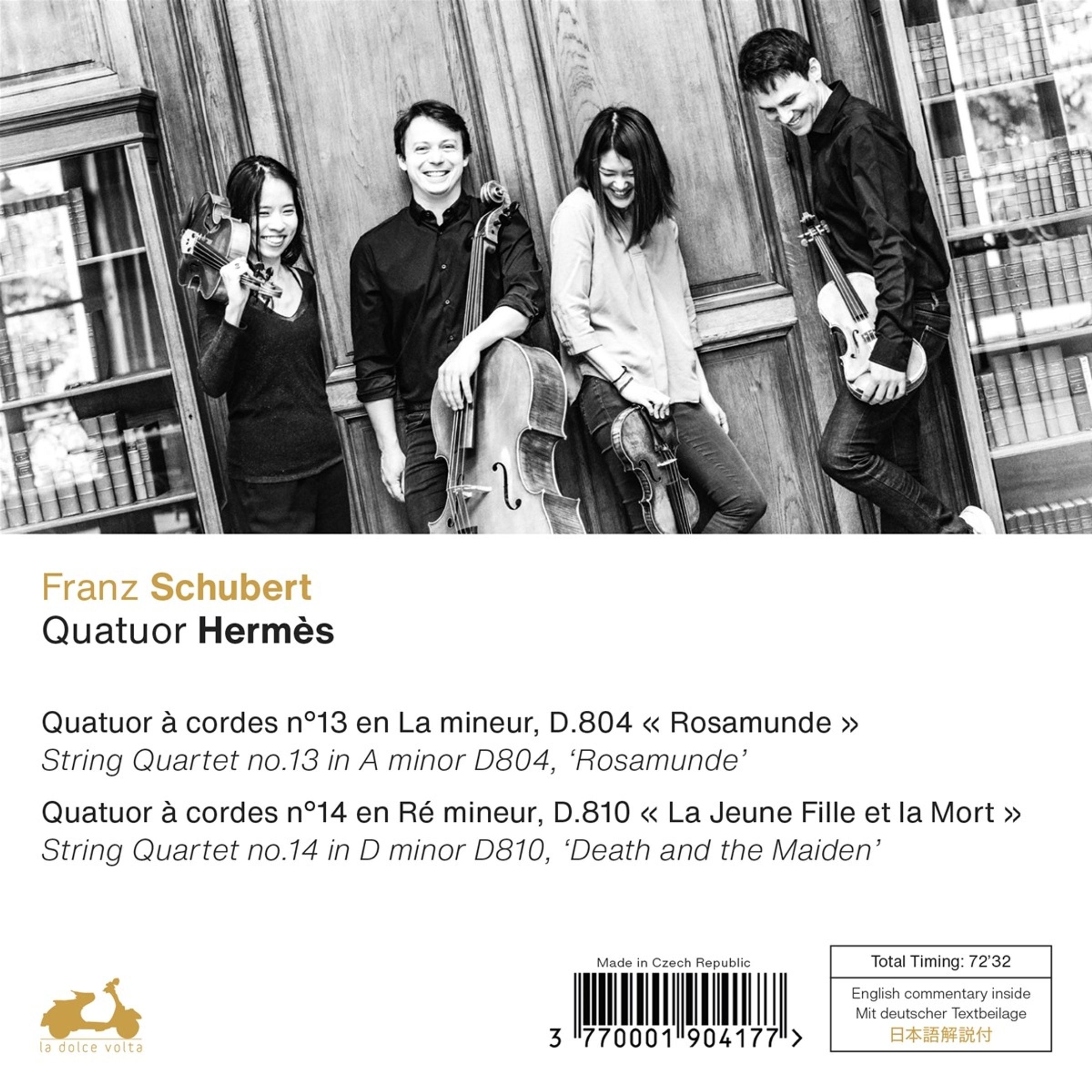 Das Quatuor Hermès, benannt nach dem griechischen Götterboten, schöpft seine musikalische Kraft aus seiner Rolle des Mittlers zwischen dem Text des Komponisten und der Empfindsamkeit seines Publikums in aller Welt. Das Ensemble entstand 2008 am Konservatorium von Lyon. Prägend waren Begegnungen mit dem Ravel-, dem Ysaÿe- und dem Artemis-Quartett sowie mit Eberhard Feltz. Alfred Brendel nennen die vier Musiker als besonders wichtig für ihre Schubert-Interpretation. Seine Herangehensweise an den frühen Romantiker ist ausdrucksstark und von seltener Klarheit. Obwohl die beiden hier aufgenommenen Streichquartette fast zur selben Zeit entstanden sind, verkörpern sie in den Augen des Hermès-Quartetts das Yin und das Yang: Die Tragik, die Melancholie von »Der Tod und das Mädchen« einerseits und die nostalgische Zärtlichkeit von »Rosamunde« andererseits.