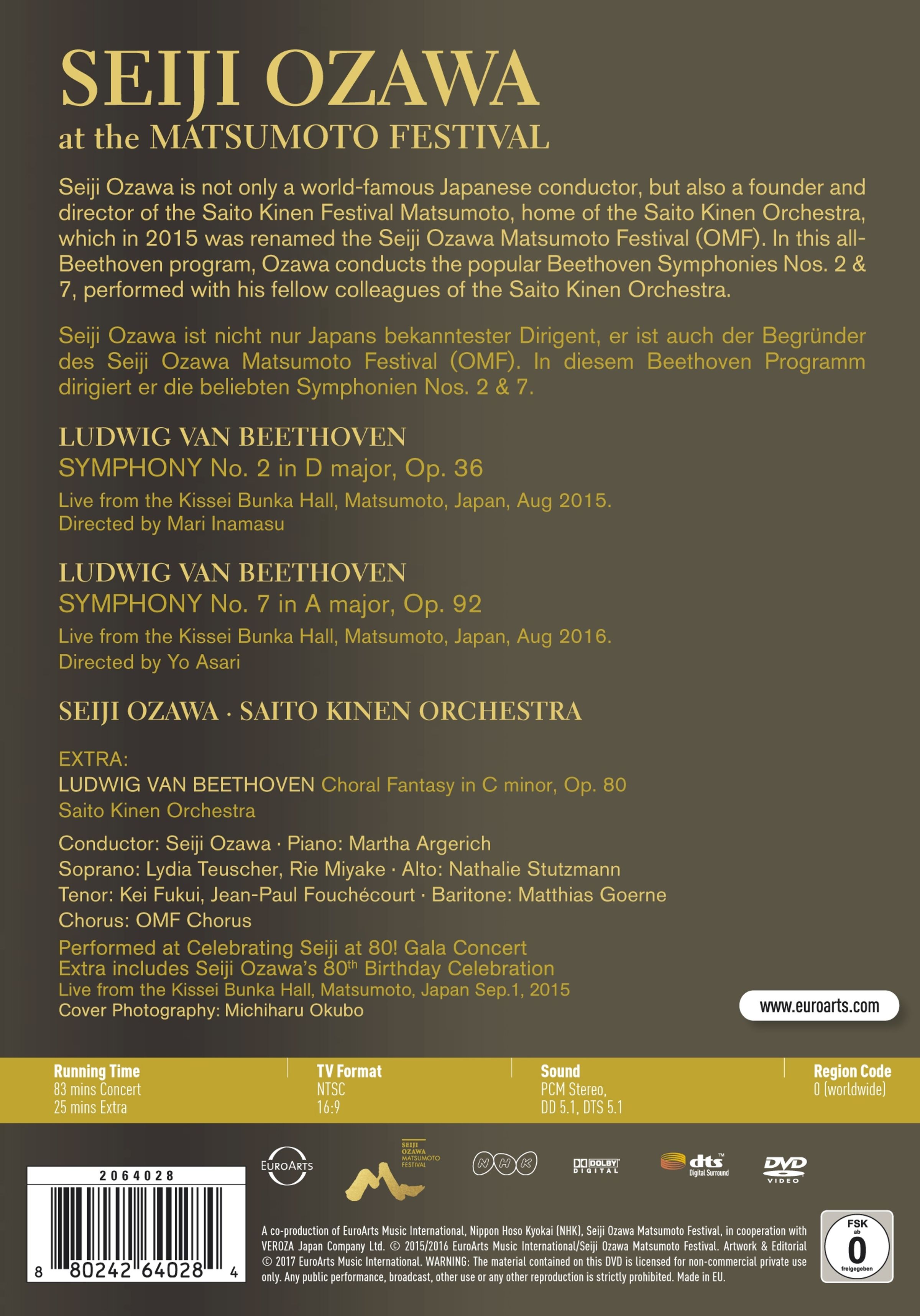 • Unter Ozawas passioniertem Dirigat konzertieren 63 Mitglieder des Saito Kinen-Orchesters: Ludwig van Beethoven Symphonie Nr. 2 in D Dur, op. 36 Live from the Kissei Bunka Hall, Matsumoto, Japan, August 2015, directed by Mari Inamasu, Yo Asari Ludwig van Beethoven SymphonieNr. 7 in A Dur, op. 92Live from the Kissei Bunka Hall, Matsumoto, Japan, August 2016, directed by Mari Inamasu, Yo Asari