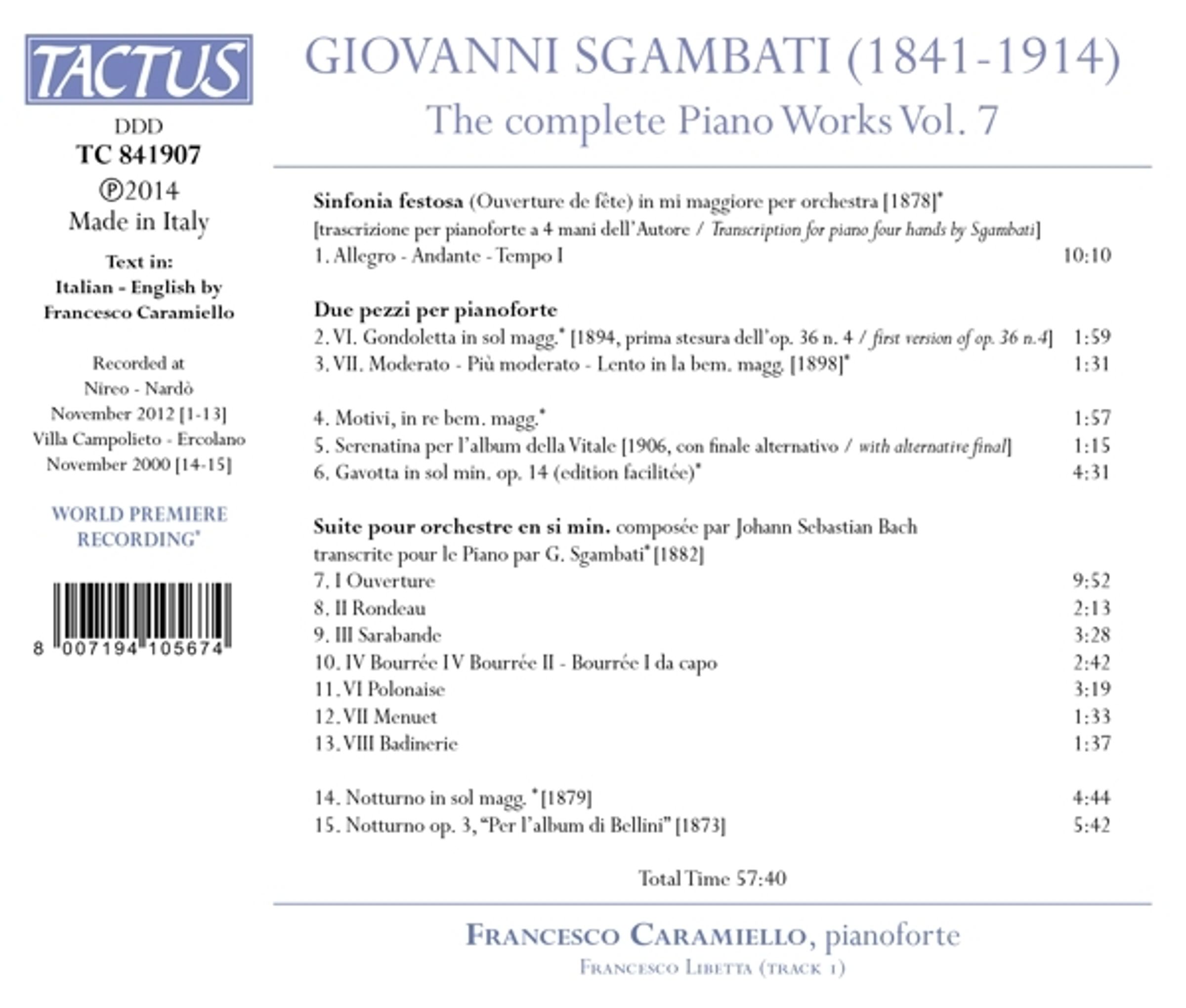 Er enthält fast ausschließlich unveröffentlichte Stücke, darunter sein letztes Notturno, die Transkription für vier Hände seines ersten bedeutenden symphonischen Werks (die Sinfonia Festosa, gespielt von Francesco Caramiello und Francesco Libetta) und eine unveröffentlichte, brillante Klavierversion von Bachs Suite in h-Moll BWV 1067, die neben den bekannten Transkriptionen von Tausig, d’Albert und Siloti in der großen Tradition von Liszts Schule steht.