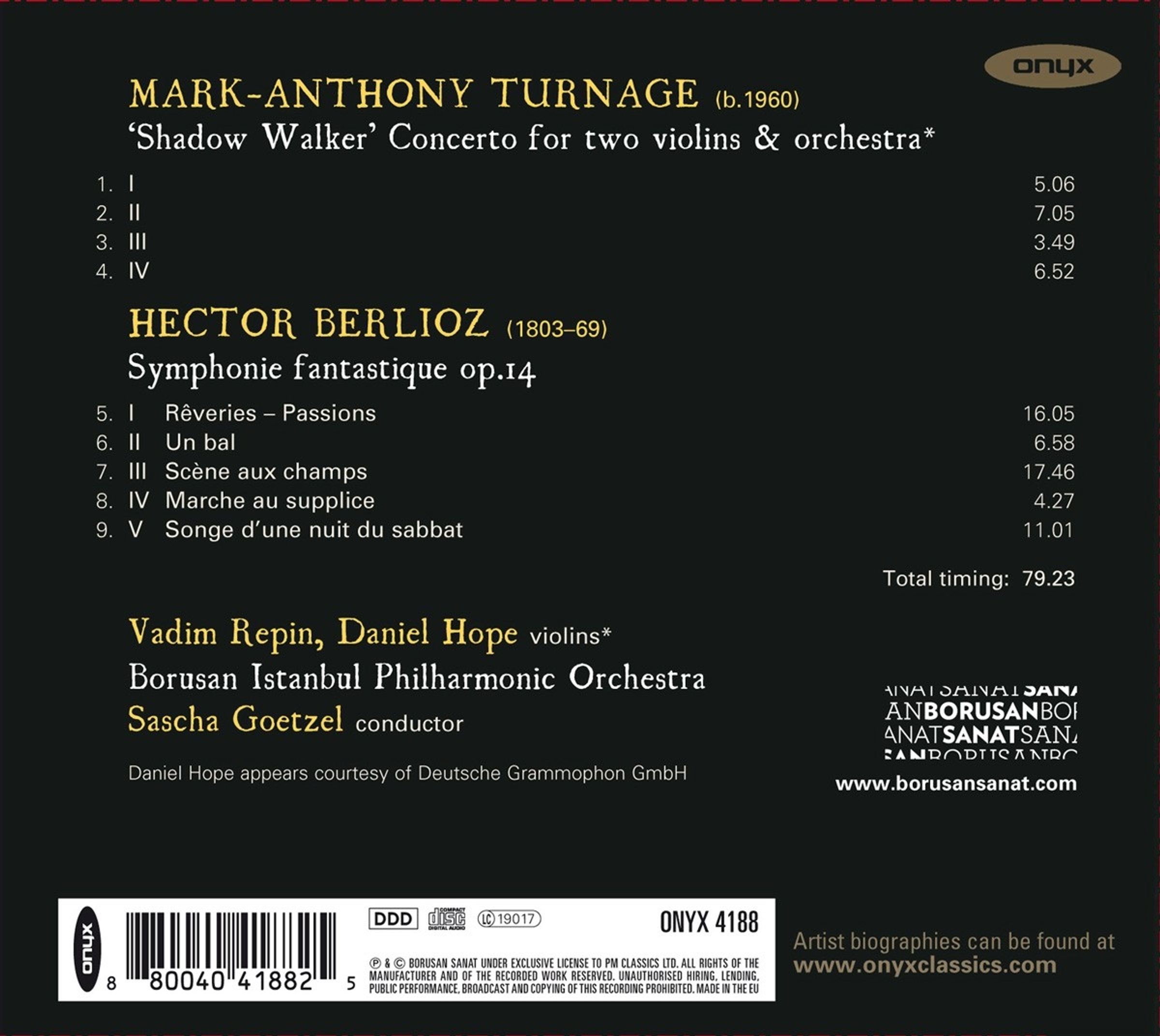 Der vorliegende Live-Mittschnitt dokumentiert ein Konzertereignis der Extraklasse: Am 23. Oktober 2017 gastierte das Borusan Istanbul Philharmonic Orchestra unter der Leitung von Sascha Goetzel beim Wiener Musikverein. Im Schlepptau hatte das Ensemble niemand geringeren als Daniel Hope und Vadim Repin, die zusammen Mark-Anthony Turnages jüngst verfasstes kompromissloses, jazziges Konzert für zwei Violinen (»Shadow Walker«) unter tosendem Beifall aufführten. In der zweiten Hälfte des Konzertes erklang dann Berlioz’ ekstatische »Symphonie Fantastique«, die von den Musikern mit jugendlichem Esprit und großer Tatkraft dargeboten wurde.