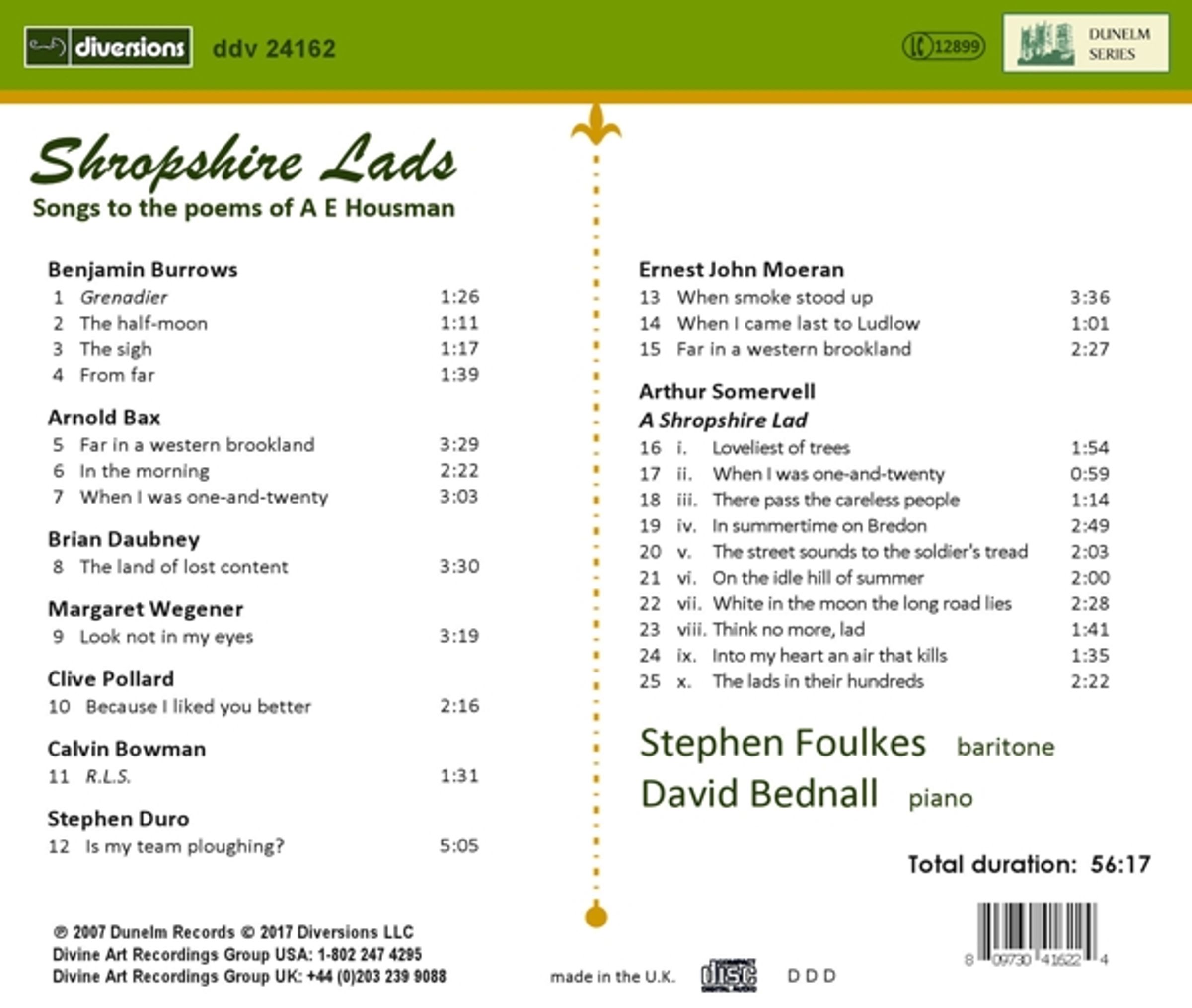 Dies ist das erste von vier Alben mit Live-Konzerten der EPSS, die Dunelm für den privaten Gebrauch erstellt hat und die nun aufgrund der Nachfrage allgemein veröffentlicht werden. Es enthält Werke bedeutender Komponisten und auch der fünf hervorragenden Finalisten des EPSS-Wettbewerbs von 2006. Das Konzert fand anlässlich des 110. Jahrestags der Veröffentlichung von A. E. Housmans A Shropshire Lad statt.