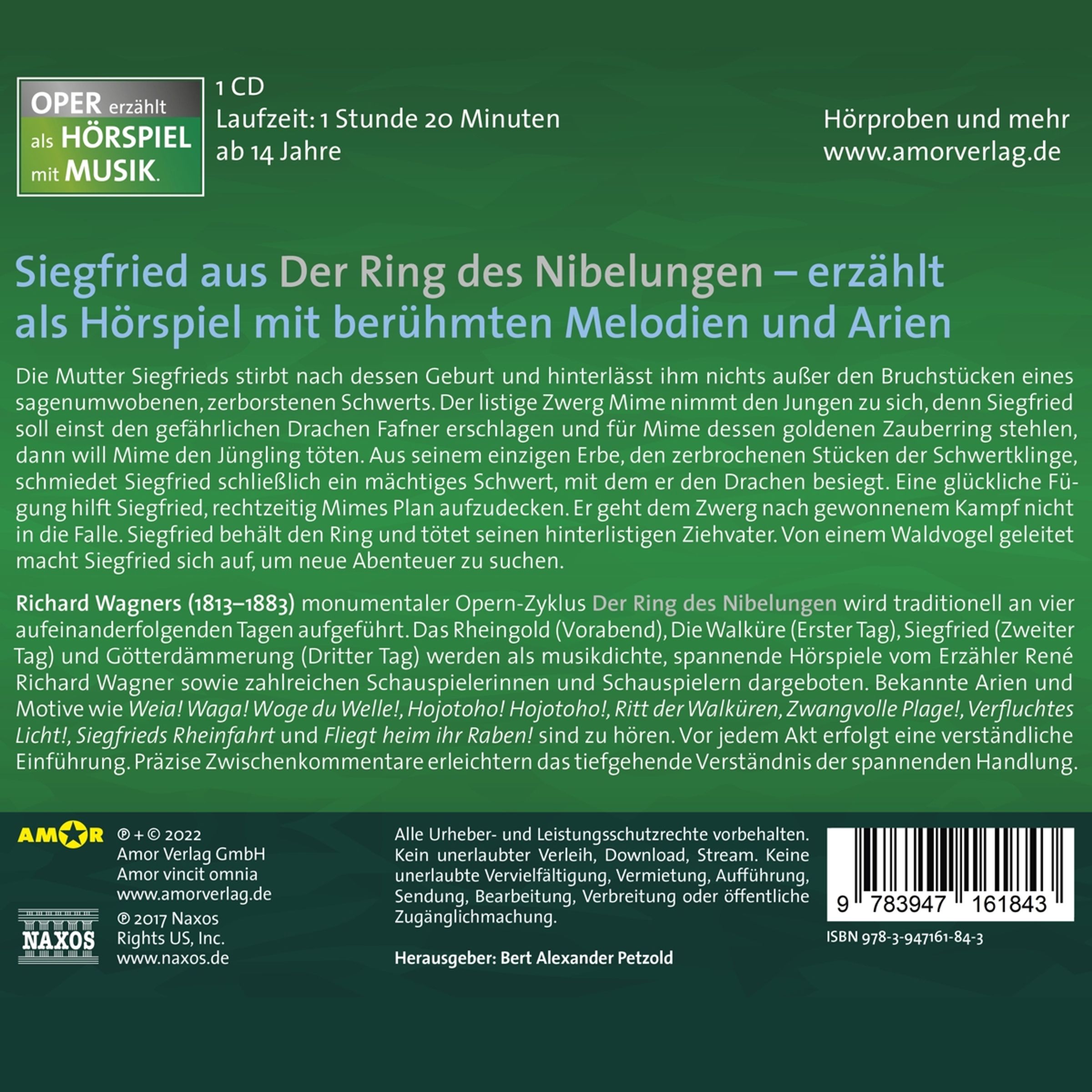 ichard Wagners (1813–1883) monumentaler, vierteiliger Opern-Zyklus „Der Ring des Nibelungen“ wird traditionell an vier aufeinanderfolgenden Tagen aufgeführt. Der dritte Teil, „Siegfried“, wird als packendes, effektreiches Hörspiel von Schauspielerinnen und Schauspielern und mit bekannten Arien und tragender Opernmusik dargeboten. Vor jedem Akt der Opern erfolgt eine verständliche Einführung, zudem erfährt man einiges über das Leben und musikalische Werk des berühmten Komponisten.