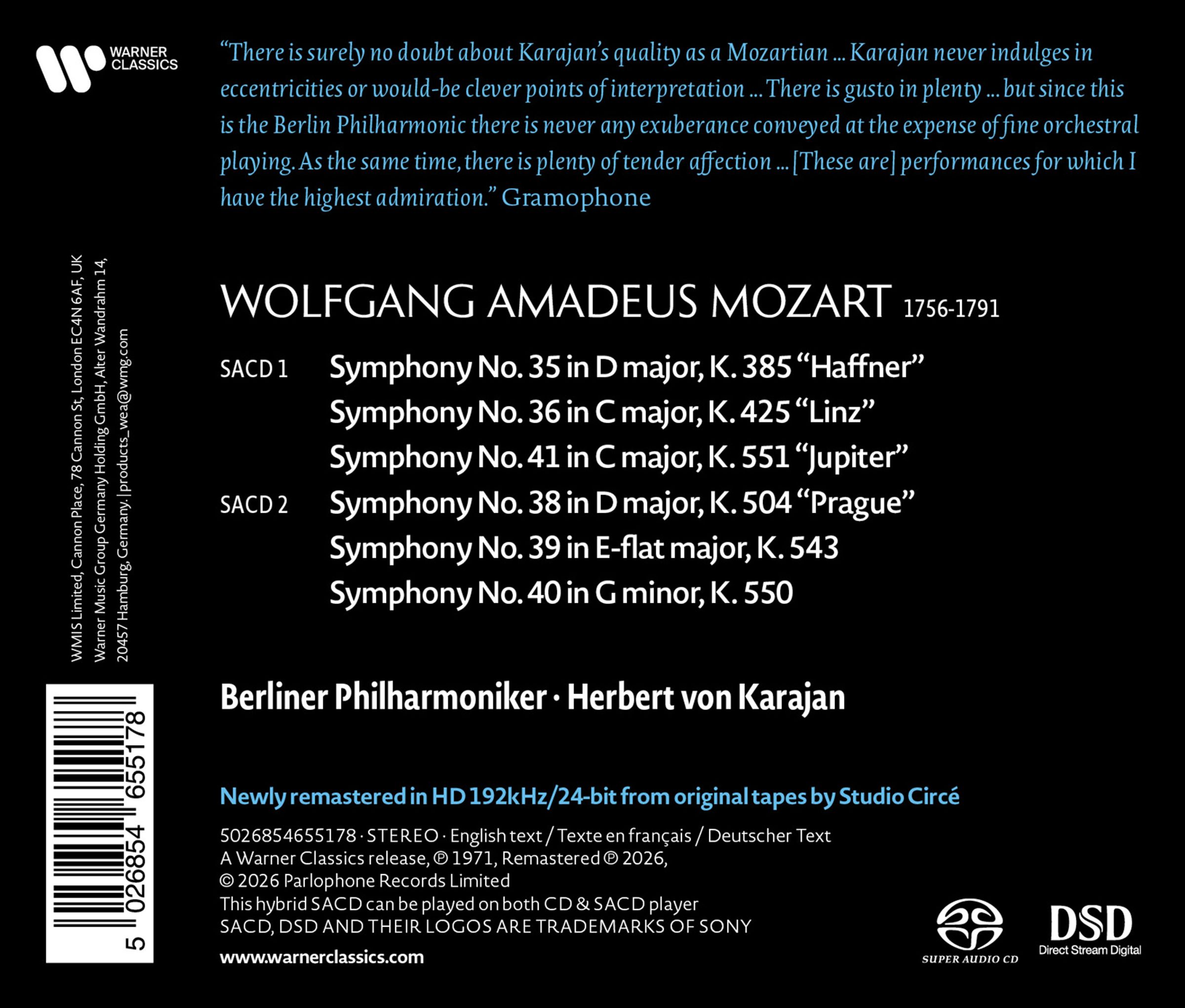 In den 1970er-Jahren schuf Herbert von Karajan mit den Berliner Philharmonikern für die EMI Referenzaufnahmen von Mozarts späten Sinfonien, die sich durch eine besondere Leuchtkraft auszeichnen. Im Vergleich zu seinen späteren Produktionen wirkt das Klangbild hier weniger düster, bewahrt aber die für Karajan typische, seidige Textur und das meisterhafte Legato. Von feierlichen Einleitungen über metaphysisch anmutende langsame Sätze bis hin zu den prachtvoll gestalteten Finalsätzen der „Jupiter“- oder „Haffner“-Sinfonie zeigt sich der Dirigent hier von seiner attraktivsten Seite. Für die aktuelle SACD-Veröffentlichung wurden diese historischen Aufnahmen nun in hochauflösendem HD 192 / 24 von den Originalbändern neu gemastert.