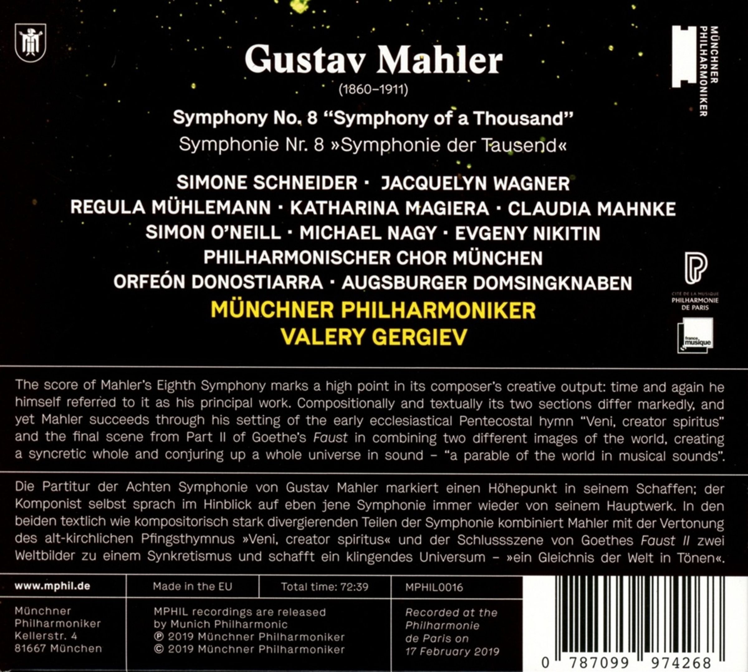 Im Jahre 2018 konnten die Münchner Philharmoniker ihr 125-jähriges Jubiläum feiern. Als eines der traditionsreichsten Orchester Deutschlands hat das Ensemble Musikgeschichte geschrieben. Ein ganz besonderer Moment war die Uraufführung eines der gewaltigsten Werke der klassischen Musik überhaupt: die Premiere der 8. Sinfonie von Gustav Mahler, auch bekannt als Sinfonie der Tausend unter der Stabführung des Komponisten am 12. September 1910. Mit einer fulminant besetzten Interpretation feierte das Orchester unter der Leitung von Valery Gergiev seine Verbundenheit zu Mahler unter anderem mit einer Aufführung in Paris im Februar 2019. Jetzt erscheint das Großereignis als Album.