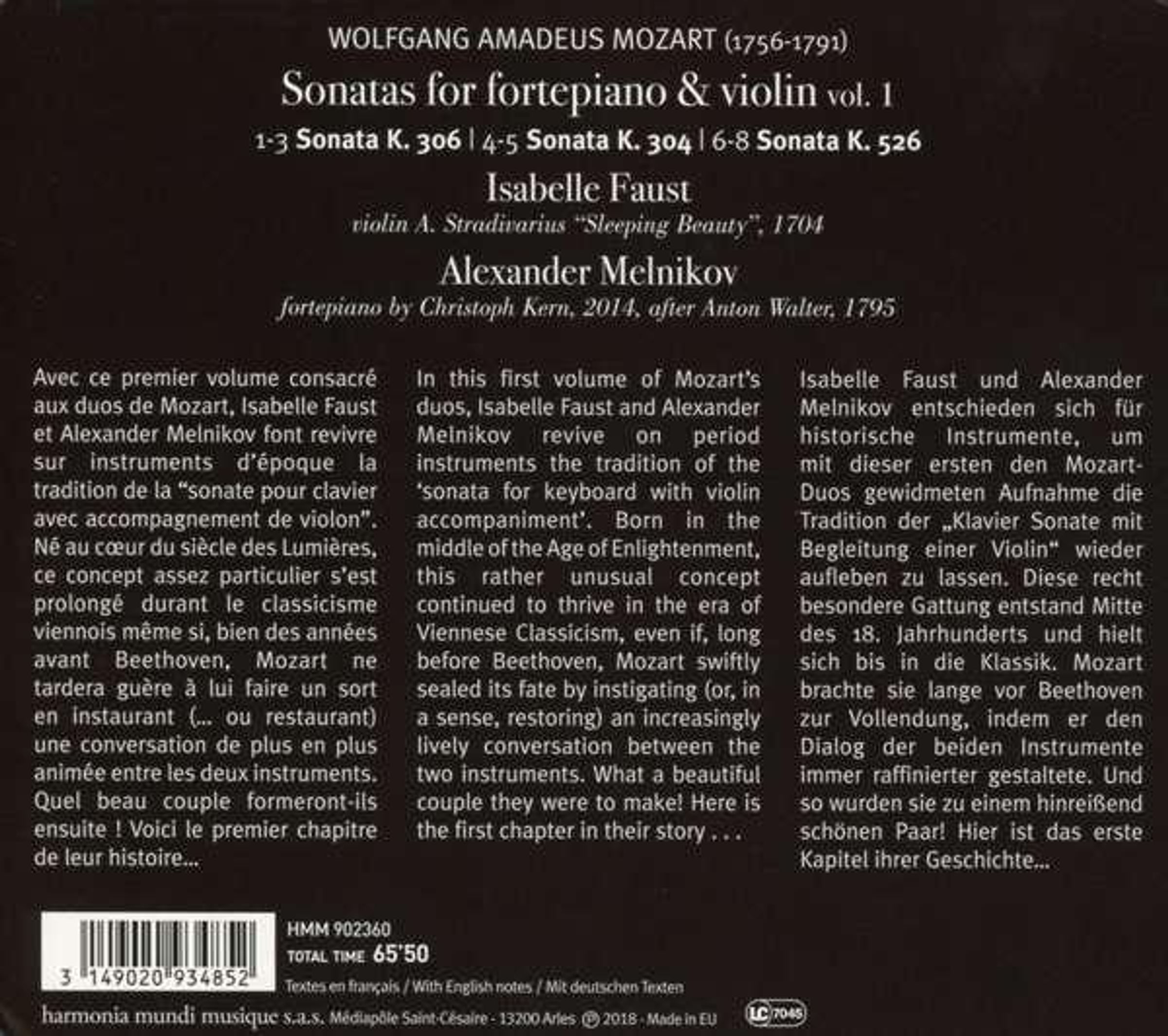 Isabelle Faust und Alexander Melnikov entschieden sich für historische Instrumente, um mit dieser ersten den Mozart-Duos gewidmeten Aufnahme die Tradition der »Klavier Sonate mit Begleitung einer Violin« wieder aufleben zu lassen. Diese recht besondere Gattung entstand Mitte des 18. Jahrhunderts und hielt sich bis in die Klassik. Mozart brachte sie lange vor Beethoven zur Vollendung, indem er den Dialog der beiden Instrumente immer raffinierter gestaltete. Und so wurden sie zu einem hinreißend schönen Paar! Das erste Kapitel ihrer Geschichte liegt nun vor …