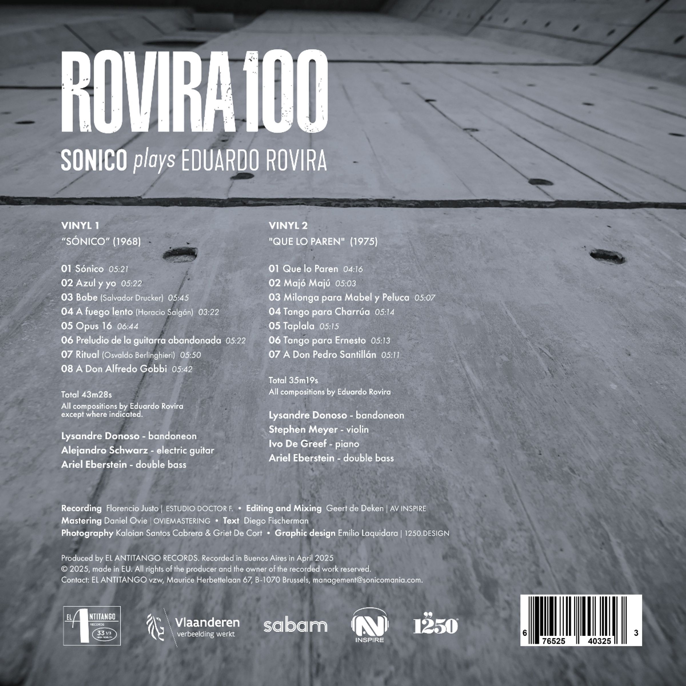 "Rovira 100" markiert einen doppelten Meilenstein: den 100. Geburtstag von Eduardo Rovira und das 10-jährige Jubiläum von Sonico. Aufgenommen in Buenos Aires während ihrer Lateinamerika-Tournee im April 2025 - gekrönt von einem historischen Auftritt im Teatro Colon - greift dieses fünfte Studioalbum Roviras ikonische Alben "Sonico" (1969) und "Que lo Paren" (1975) wieder auf und interpretiert sie neu, sorgfältig rekonstruiert nach jahrelanger Archivforschung. Obwohl Eduardo Rovira oft im Schatten von Astor Piazzolla stand, schlug er seinen eigenen radikalen Weg bei der Erneuerung des Tangos ein, indem er Jazz-Einflüsse, zeitgenössische klassische Techniken und gewagte rhythmische Veränderungen einfließen ließ. Seine komplexe, poetische und filmische Musik hat den Tango weit über seine traditionellen Grenzen hinausgetragen. Das Ensemble Sonico wurde 2015 in Brüssel gegründet und hat sich mit seinen historisch fundierten Aufführungen und bahnbrechenden Archivforschungen internationale Anerkennung erworben. Durch die Transkription und Wiederherstellung verlorener Partituren aus der Mitte des 20. Jahrhunderts hat Sonico vergessenes Repertoire wieder auf die Bühne gebracht. Ihre Tourneen führten sie zu führenden Veranstaltungsorten und Festivals, darunter De Bijloke Gent, Concertgebouw Brügge, Philharmonie Luxemburg, Heidelberger Frühling, Tonhalle Düsseldorf und Cemal Resit Rey Concert Hall in Istanbul. In dieser Saison geben sie ihr Debüt in der Elbphilharmonie Hamburg und im Bozar Brüssel (Henry Le Boeuf Hall) mit "Sinfonia de Tango", einer sinfonischen Kreation in Zusammenarbeit mit dem Brussels Philharmonic, die im Marz 2026 aufgeführt wird.
