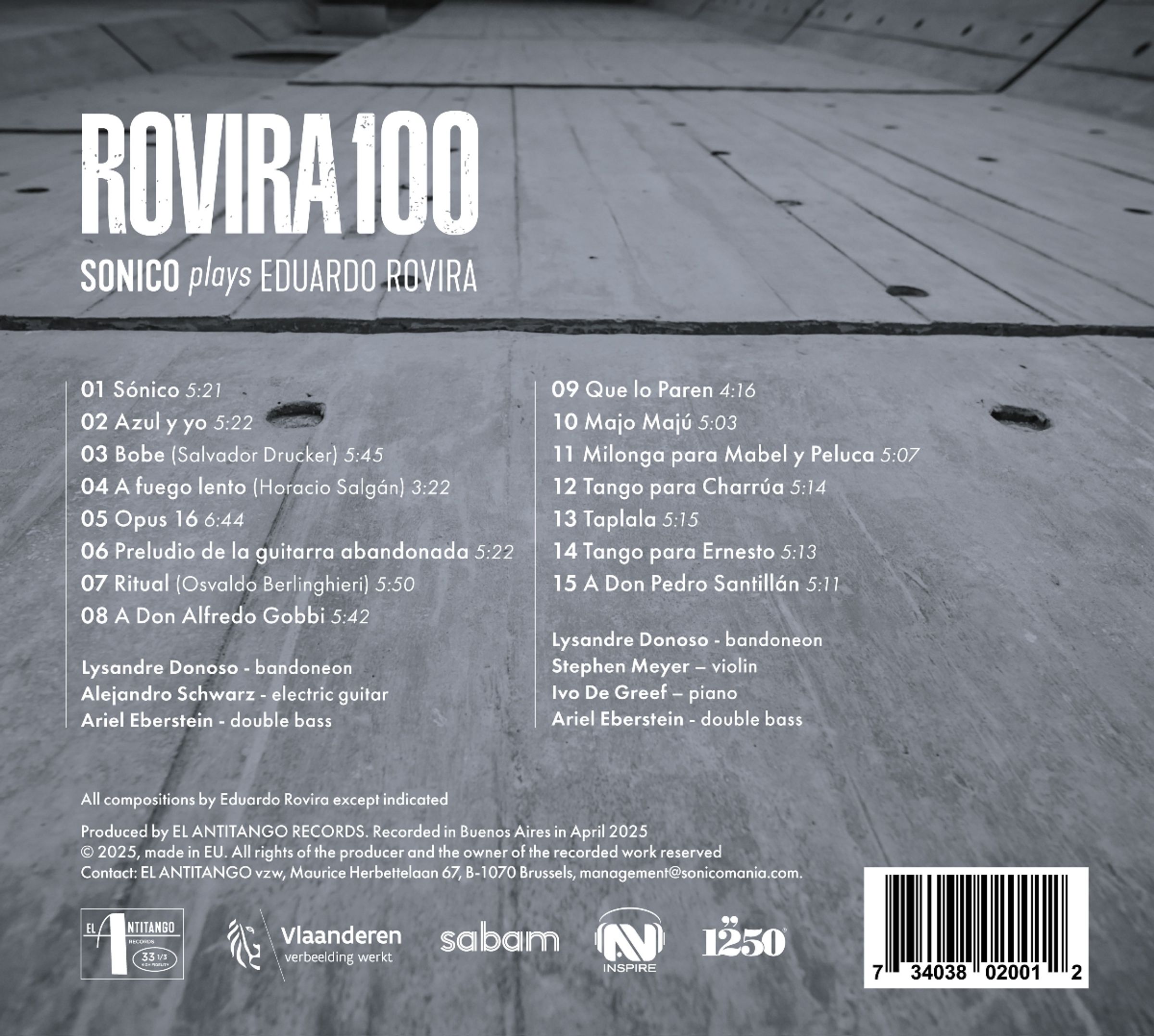 "Rovira 100" markiert einen doppelten Meilenstein: den 100. Geburtstag von Eduardo Rovira und das 10-jährige Jubiläum von Sonico. Aufgenommen in Buenos Aires während ihrer Lateinamerika-Tournee im April 2025 - gekrönt von einem historischen Auftritt im Teatro Colon - greift dieses fünfte Studioalbum Roviras ikonische Alben "Sonico" (1969) und "Que lo Paren" (1975) wieder auf und interpretiert sie neu, sorgfältig rekonstruiert nach jahrelanger Archivforschung. Obwohl Eduardo Rovira oft im Schatten von Astor Piazzolla stand, schlug er seinen eigenen radikalen Weg bei der Erneuerung des Tangos ein, indem er Jazz-Einflüsse, zeitgenössische klassische Techniken und gewagte rhythmische Veränderungen einfließen ließ. Seine komplexe, poetische und filmische Musik hat den Tango weit über seine traditionellen Grenzen hinausgetragen. Das Ensemble Sonico wurde 2015 in Brüssel gegründet und hat sich mit seinen historisch fundierten Aufführungen und bahnbrechenden Archivforschungen internationale Anerkennung erworben. Durch die Transkription und Wiederherstellung verlorener Partituren aus der Mitte des 20. Jahrhunderts hat Sonico vergessenes Repertoire wieder auf die Bühne gebracht. Ihre Tourneen führten sie zu führenden Veranstaltungsorten und Festivals, darunter De Bijloke Gent, Concertgebouw Brügge, Philharmonie Luxemburg, Heidelberger Frühling, Tonhalle Düsseldorf und Cemal Resit Rey Concert Hall in Istanbul. In dieser Saison geben sie ihr Debüt in der Elbphilharmonie Hamburg und im Bozar Brüssel (Henry Le Boeuf Hall) mit "Sinfonia de Tango", einer sinfonischen Kreation in Zusammenarbeit mit dem Brussels Philharmonic, die im Marz 2026 aufgeführt wird.