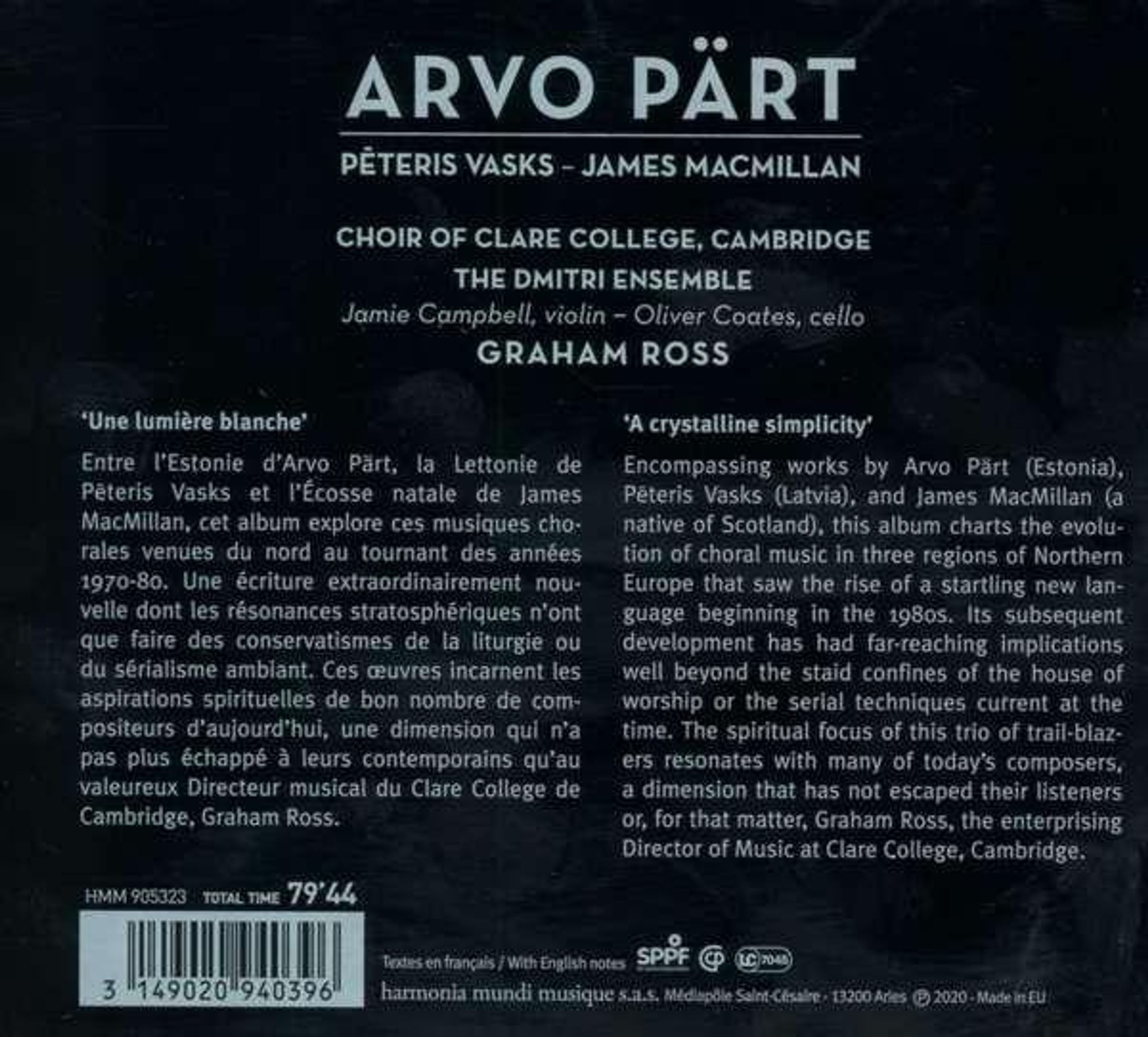 Als er sich Ende der Sechzigerjahre von der seriellen Technik entfernte und eine gewisse spirituelle und künstlerische Wandlung vollzogen hatte, wandte sich Arvo Pärt der Chortradition des Mittelalters und der Renaissance zu. Aus dieser Zeit des intensiven Studierens entstanden Meisterwerke, die Pärts heute unverwechselbaren Stil begründeten, den er selbst »Tintinnabuli« nennt (lateinisch tintinnabulum: Klingel, Schelle). In einer raffinierten, zeitlosen Klangwelt wird die erste Stimme von einem Dreiklang (wie Glocken) getragen, dem eine zweite in diatonischen Schritten gegenübersteht. Die beseelte Interpretation geistlicher Werke Pärts durch den Choir of Clare College, Cambridge unter Graham Ross schwebt im Raum und könnte den größten Häretiker bekehren.