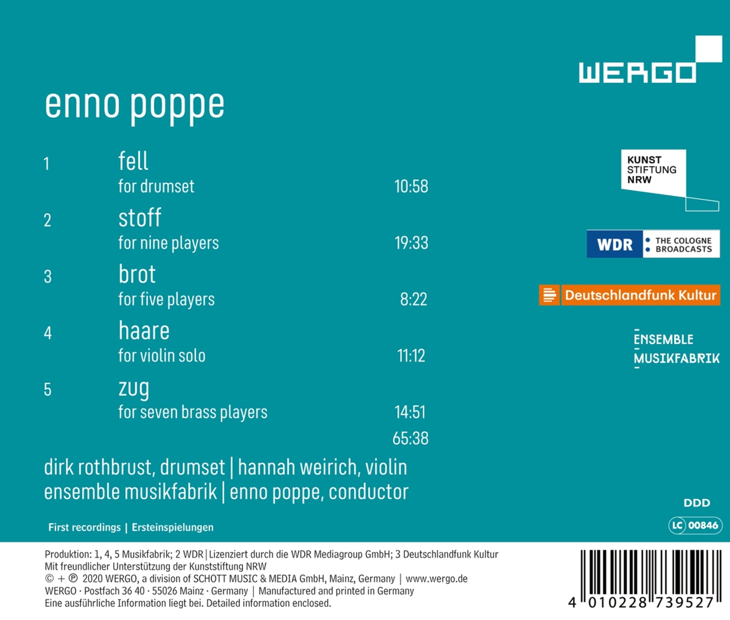 Mit dem Ensemble Musikfabrik in Köln arbeitet Poppe seit vielen Jahren eng als Dirigent zusammen und hat eigens für das Ensemble zahlreiche Stücke geschrieben. Das aktuelle Album versammelt diese kammermusikalischen Werke, darunter auch »Stoff« für neun Musiker. Auch das Auftauchen und Verschwinden motivischer Fäden ist charakteristisch für den »Nouveau Roman«. Auch die Titel und Klänge der anderen Werke sind direkt und vieldeutig zugleich. Dieses Album ist Teil der umfangreichen Reihe, die WERGO zur Musik Enno Poppes dokumentiert.