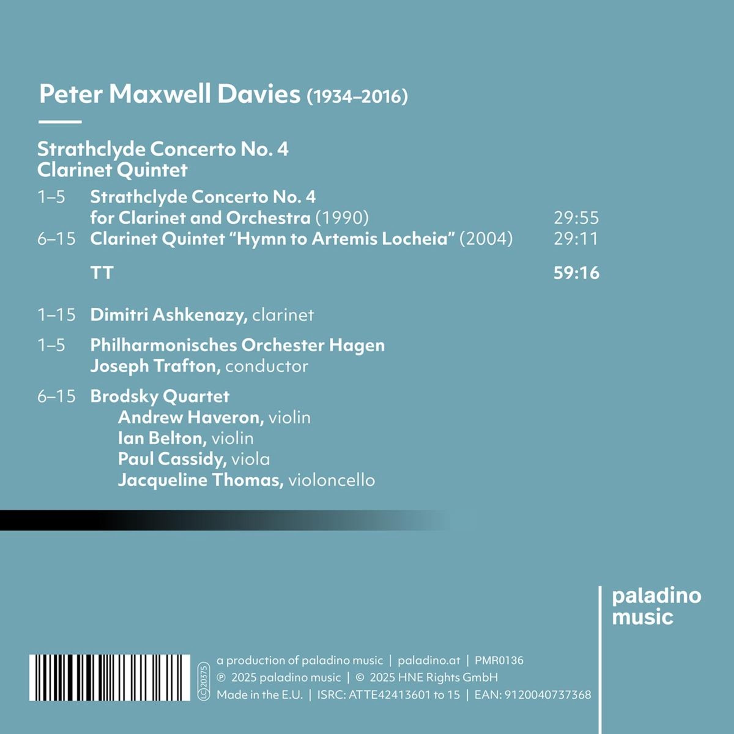 Dimitri Ashkenazy reflektiert mit dieser Aufnahme seine langjährige künstlerische Beziehung mit Peter Maxwell Davies – beginnend mit dem Strathclyde Concerto Nr. 4, dessen Suche nach dem nie ganz greifbaren Thema für ihn zum Sinnbild eines musikalischen Weges wurde. Davies präzises Dirigat und die gemeinsamen Erfahrungen führten später zur Uraufführung des farben- und emotionsreichen Klarinettenquintetts Hymn to Artemis Locheia. Beide Werke, so unterschiedlich sie sind, verkörpern für Ashkenazy das zutiefst Menschliche im Musizieren: den Prozess, die Herausforderung und die bewegende Transformation, die daraus entsteht.