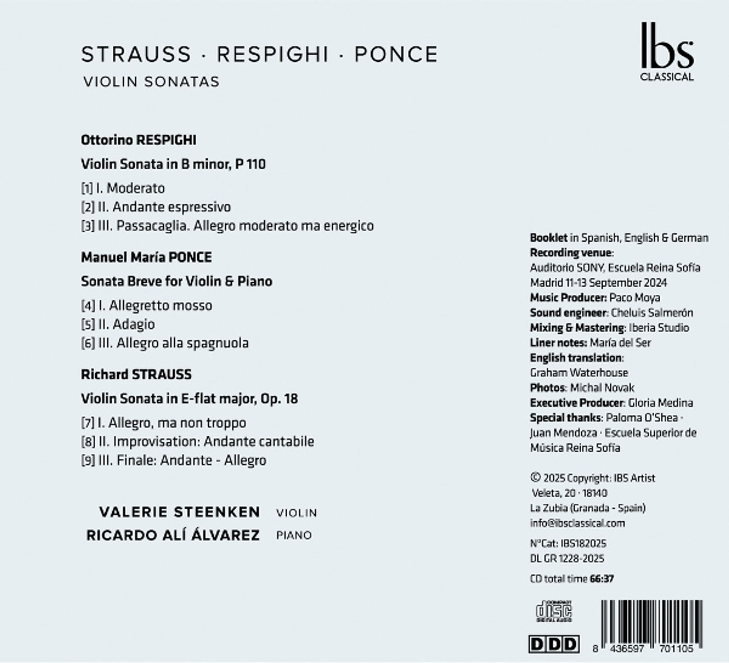 Auf diesem neuen Album spielen die Violinistin Valerie Steenken und der Pianist Ricardo Ali Alvarez drei bedeutende Violinsonaten von Richard Strauss, Ottorino Respighi und Manuel M. Ponce. Das Programm, das als Reise durch deutsche, italienische und mexikanische Traditionen konzipiert ist, schlägt eine Brücke zwischen spätromantischem lyrischen Stil und moderner Ausdruckskraft des frühen 20. Jahrhunderts. Strauss' frühe Sonate in Es-Dur, Op. 18, verbindet hochfliegende melodische Erfindungskraft mit sinfonischer Breite, während Respighis Sonate in h-Moll sich als großartige, rhetorisch aufgeladene Architektur entfaltet, die in einer majestätischen Passacaglia gipfelt. Ponces Sonata breve, 1930 in Paris geschrieben, hat einen ganz eigenen, raffinierten Stil. In dieser Aufnahme bieten Valerie Steenken (Konzertmeisterin des Spanischen Nationalorchesters) und Ricardo Ali Alvarez (Professor an der Reina Sofia School of Music) Darbietungen von außergewöhnlicher Einheit. Steenkens Strahlkraft, ihre natürliche Phrasierung und ihre ausdrucksstarke Präzision finden in Alvarez' Klavierspiel einen idealen Gegenpart - sensibel, detailreich und dynamisch gestaltet. Ihr Dialog zeugt von einem tiefen Verständnis für Struktur und Klang und lässt den emotionalen Kern jedes Werks lebendig werden.