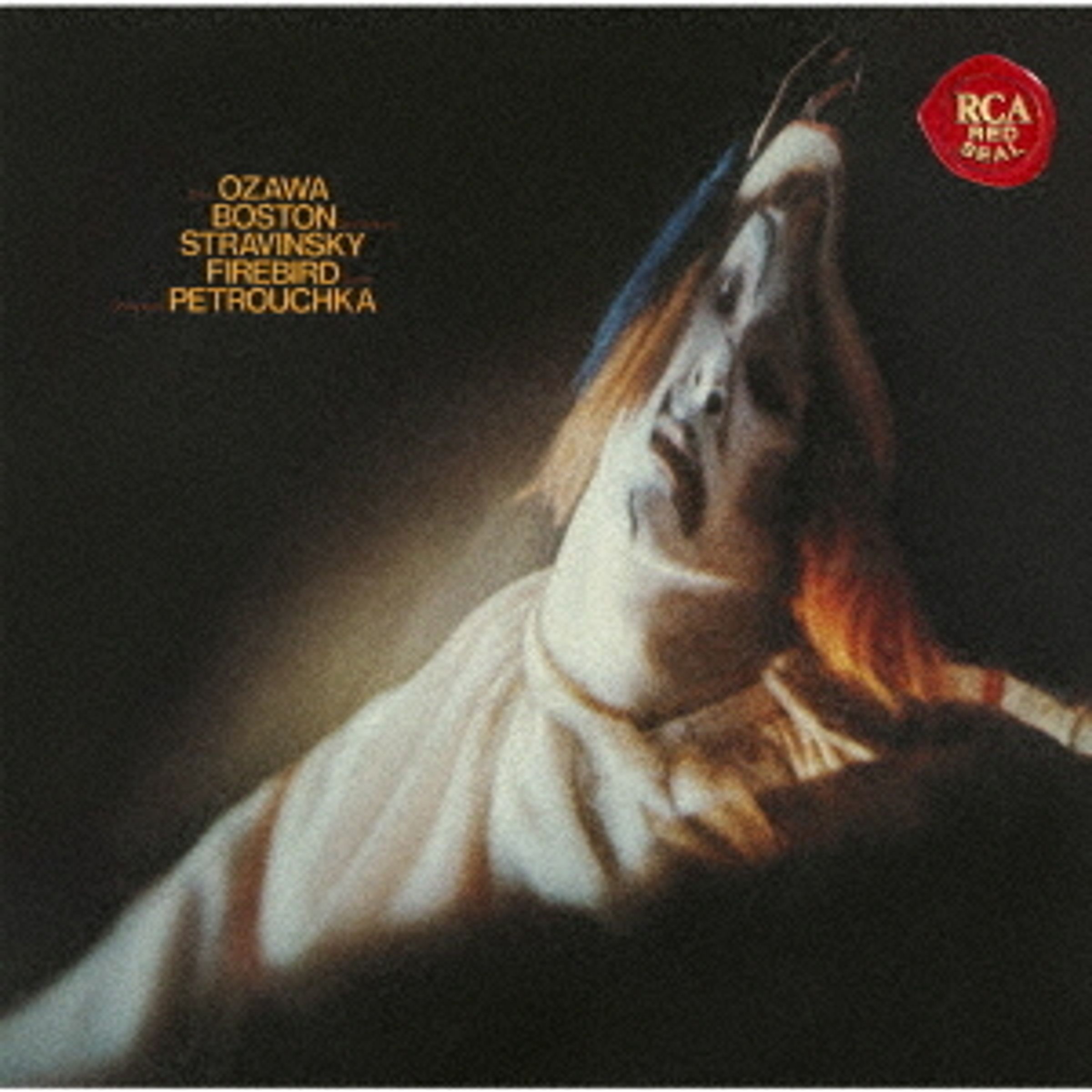"Ozawa Boston Stravinsky Firebird Petrouchka" in roter Schrift, daneben asiatische Schriftzeichen; unscharfe Person mit Lichtspiel., Super Audio CD