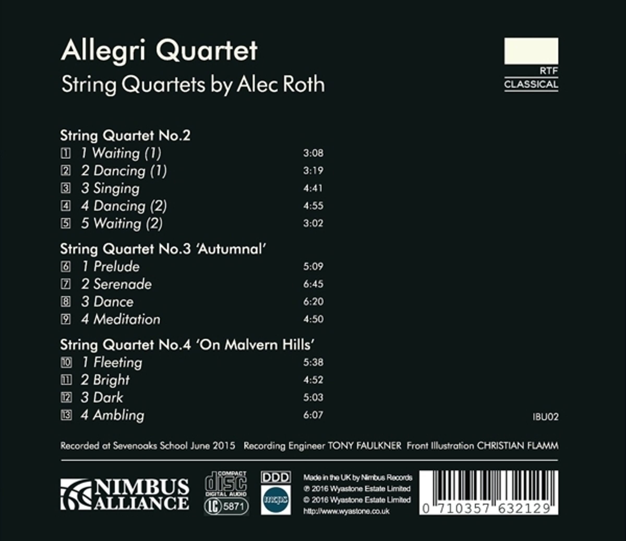 »Herzlich aufgenommen und großartig gespielt von dieser neuesten Inkarnation des Allegri Quartetts.« theartsdesk.com»Das Allegri Quartett bietet erstklassige Darbietungen einer beeindruckenden Gruppe von Quartetten von Alec Roth, voller großartiger Ideen, Strukturen und Rhythmen auf einer neuen Veröffentlichung von Nimbus.« theclassicalreviewer.blogspot.co.uk